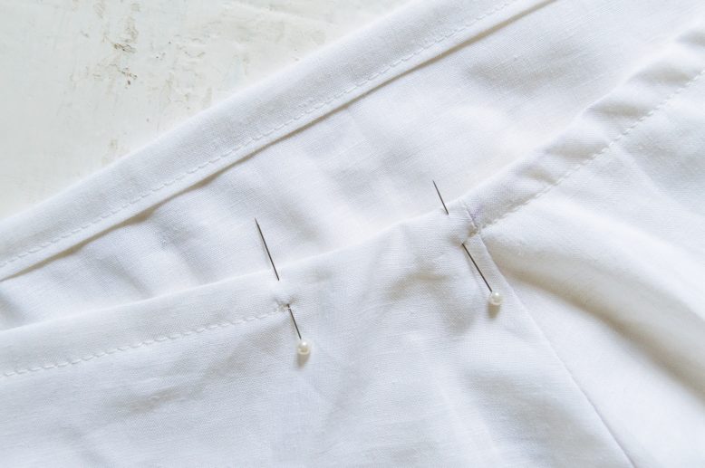 Finish the top raw edge by doing a rolled hem, but leave an 2.5 cm (1 inch) opening for threading in the elastic later on.