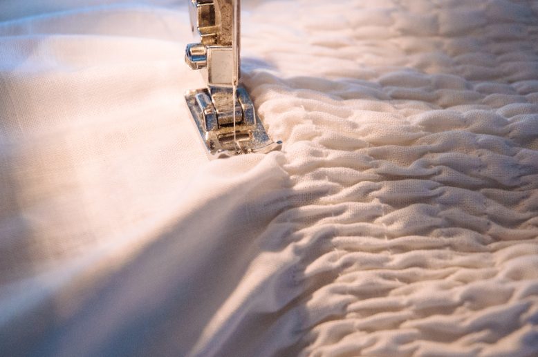 Now it's time for shirring. We used this method here. Settle in because it's going to take you a while! We set our shirred lines 1 cm (3/8 of an inch) apart. Once the shirring is done,you can thread in the piece of elastic along the top edge and sew the ends together.