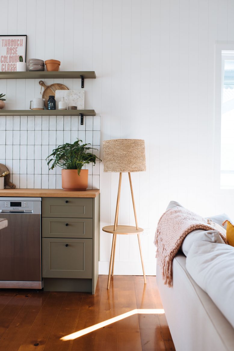 Kaboodle cabinets and benchtops | Custom Painted in Haymes ‘Bay Berry’ | Kethy Doorknobs | Bellini Oven, Cooktop, Rangehood and Dishwasher | Tilecloud Backsplash | Bunnings Square Sink | Caroma Matte Black Tap | Open Shelves DIYed from Bunnings | Vintage Table | Stools from Freedom | Tall white Vase from Bach Living | Terracotta Pots from Bunnings | Wooden Platters from Bach Living | Raffia Lamp from Bach Living