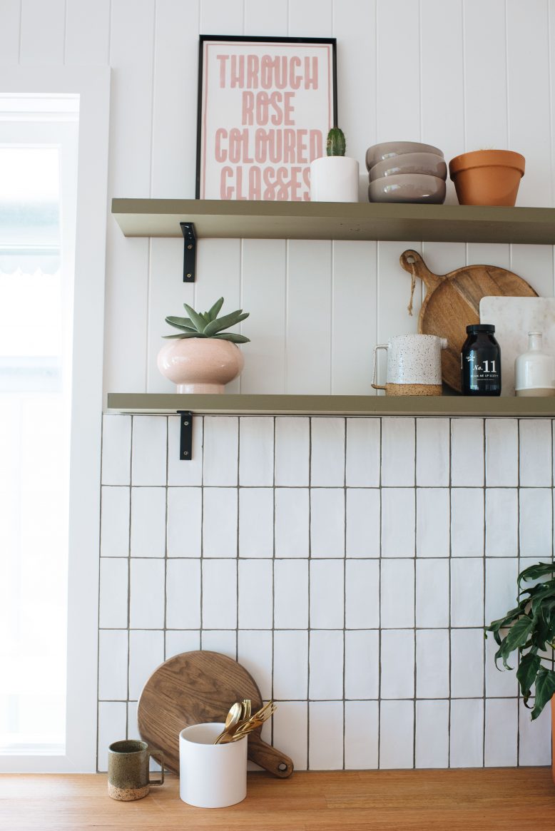 Matching Shelving DIY Project To make the whole space feel more complete, and to tie the aesthetics of the cabinets together, we built some DIY floating shelves. All the materials from these we got from Bunnings – wood planks that we painted in the same shade as the cabinets, and matte black shelf brackets.