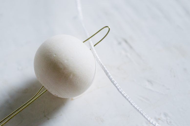 Begin threading the beads onto the string. A quick way to do this is to use a folded piece of wire and use it as a threading guide.