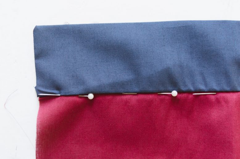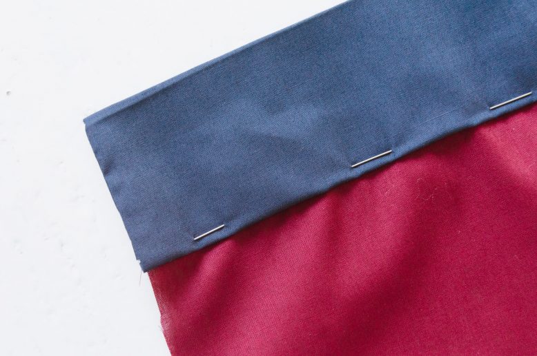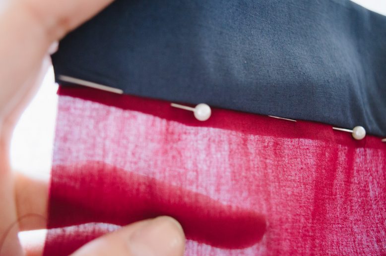 Since the fabric I used for this demonstration is sheer, you can see that the folded edge of the back piece is slightly longer than the front. This is why you should be able to secure the back as you pin along the ditch.