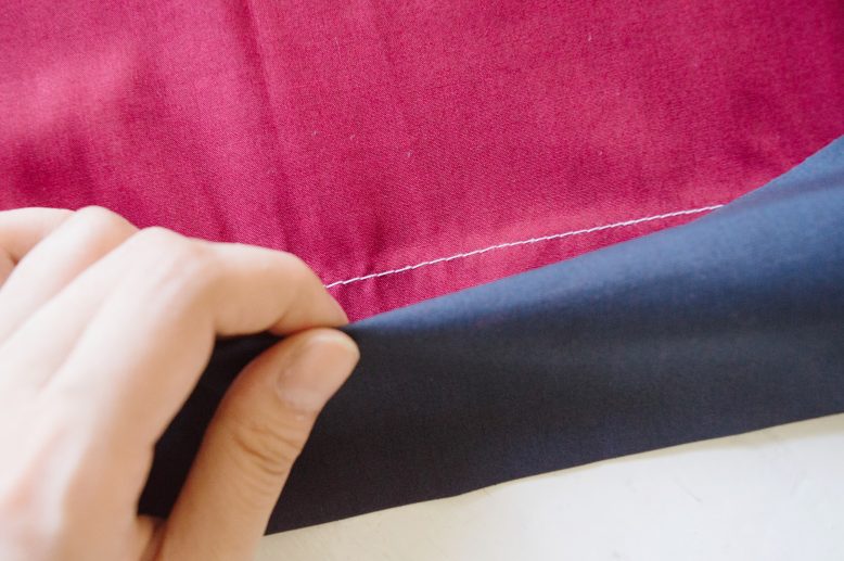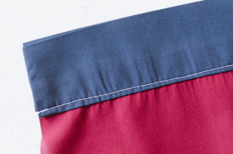 This is the back of the waistband. We used white thread for this tutorial for illustrative purposes, but you should choose thread in the same color of the waistband fabric when you sew.