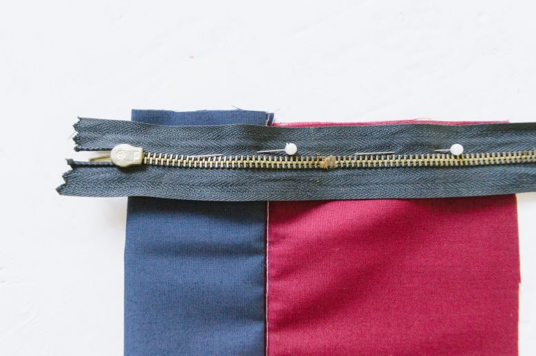 To add a zipper, pin your zipper to the seam allowances down the waistband and the pants.