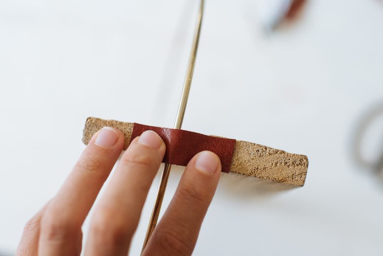 - Add some super glue to the strips of leather, and firmly press them against both sides of the wood where the circle surrounds the wood. Add enough glue so that it holds well along the length of the leather.