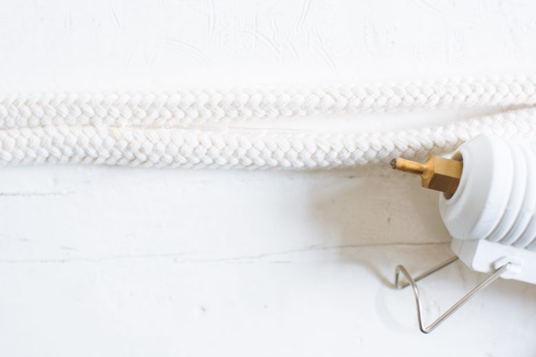- Then, I started laying them side by side and running the glue gun down the sides, pushing the new rope piece up against the glue. Be mindful not to stretch the rope as you’re glueing them to each other.