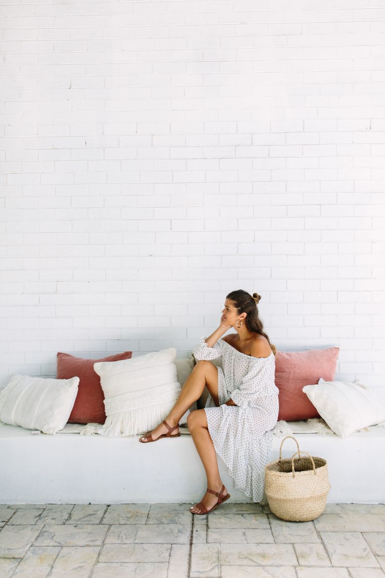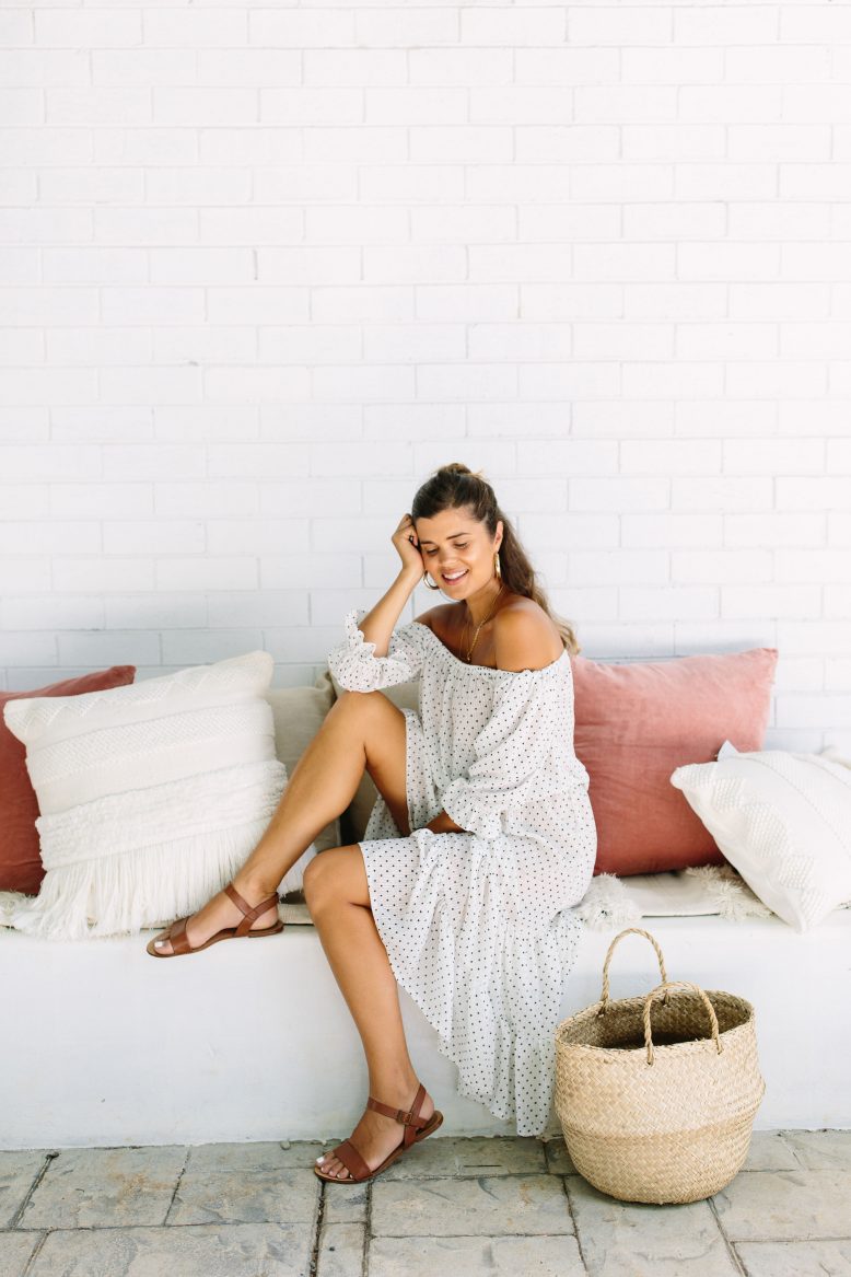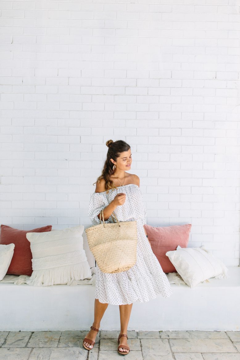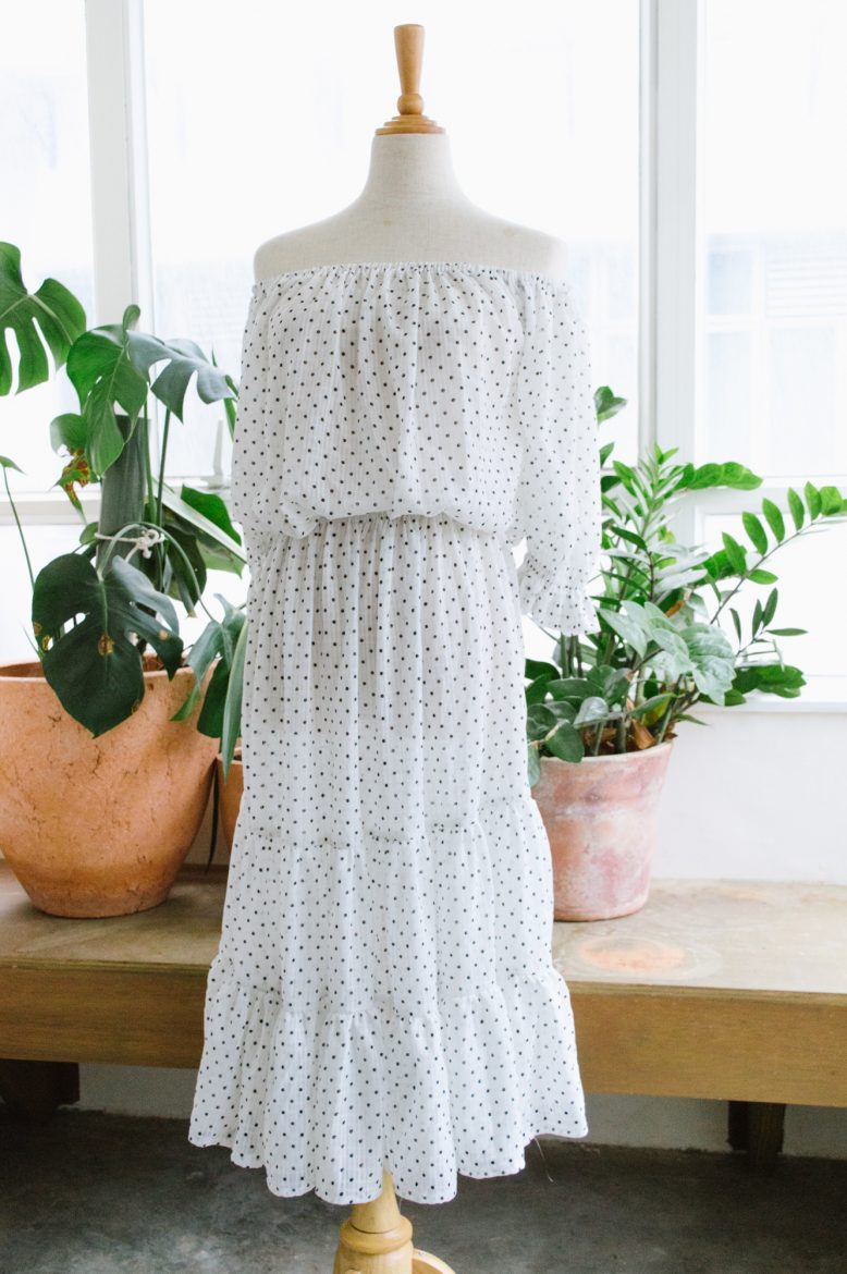 Gathered styles were what I cut my teeth on when I was first learning to sew, that is, ones where you pretty much just add elastic to rectangles of fabric to create skirts, dresses and tops. Although crazy easy, there are soooo many different variations of this style. I’m actually working on another design as we speak, in between Frankie’s naps that is! But for now, I wanted to share with you a style that saw me through my pregnancy – the gathered off the shoulder dress… Made fancy thanks to a tiered skirt. So floaty, so roomy and so so fun to wear. It made pregnancy dressing so much more bearable, and the best thing is I still want to throw it on every day!