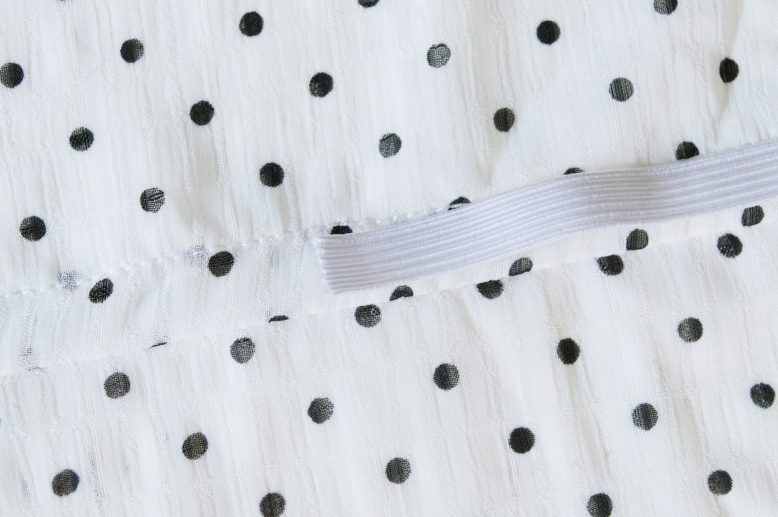 Next, you will need to sew the elastic waistband which will be done where the bodice and skirt meet. Fold over the top edge of the skirt to create a tunnel, and sew down. Sew the bodice piece to the top edge of the tunnel, and then add the elastic to gather the skirt at the waist.
