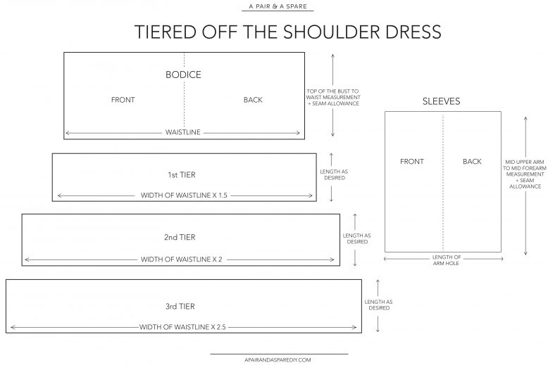 This dress might look complicated, but it’s only made up of rectangular panels… Perfect if you’re new to sewing. Draft your pattern pieces by referencing the measurements we used. We did a two-tier design, but if you’d like to play around with the layers, feel free to add and adjust the lengths of the tiers!