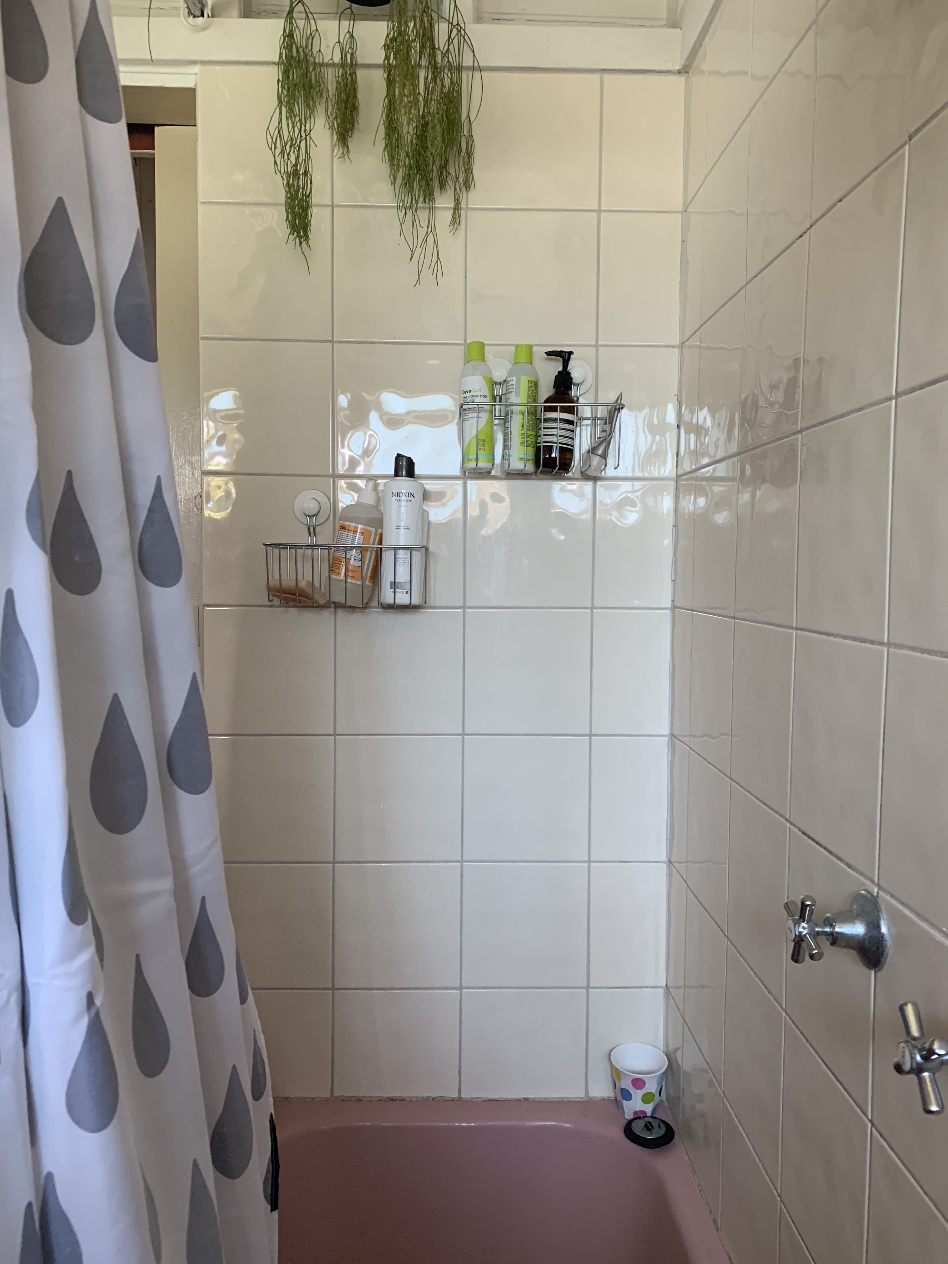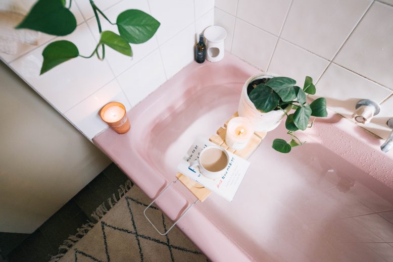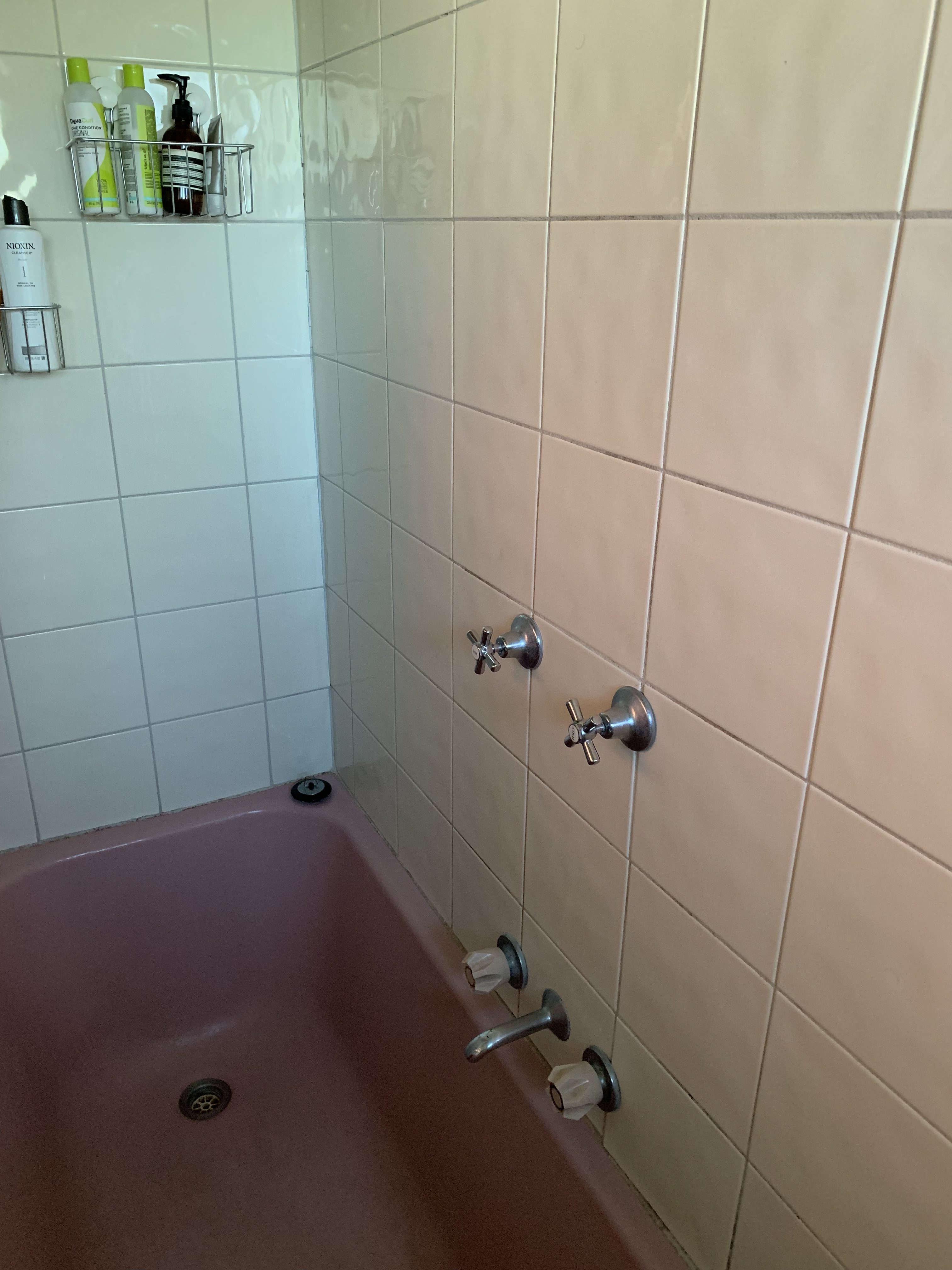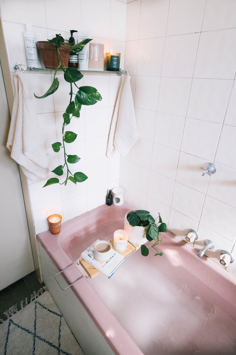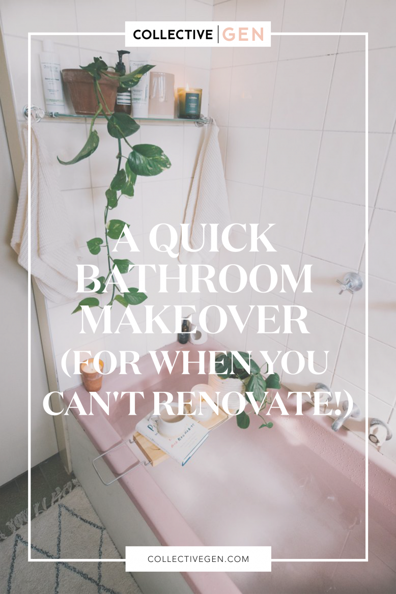 My brother has been thinking about renovating his place for a while, but has decided to put it off for a little longer. Which is why I offered to help give their space a little freshen up… I mean, I do love a challenge! I really wanted to see if it was possible to update an old bathroom without totally tearing it apart. To me it’s which is important, because a lot of the time a big renovation isn’t feasible, whether that’s because you’re renting, live with your parents or don’t want to throw all your money at the bathroom (literally, down the toilet haha). Through this process I was so happy to find that it’s easy, and very quick, to update an old bathroom into something functional and pretty. Full disclosure… My brother’s pink vintage bath kinda stole the show here.