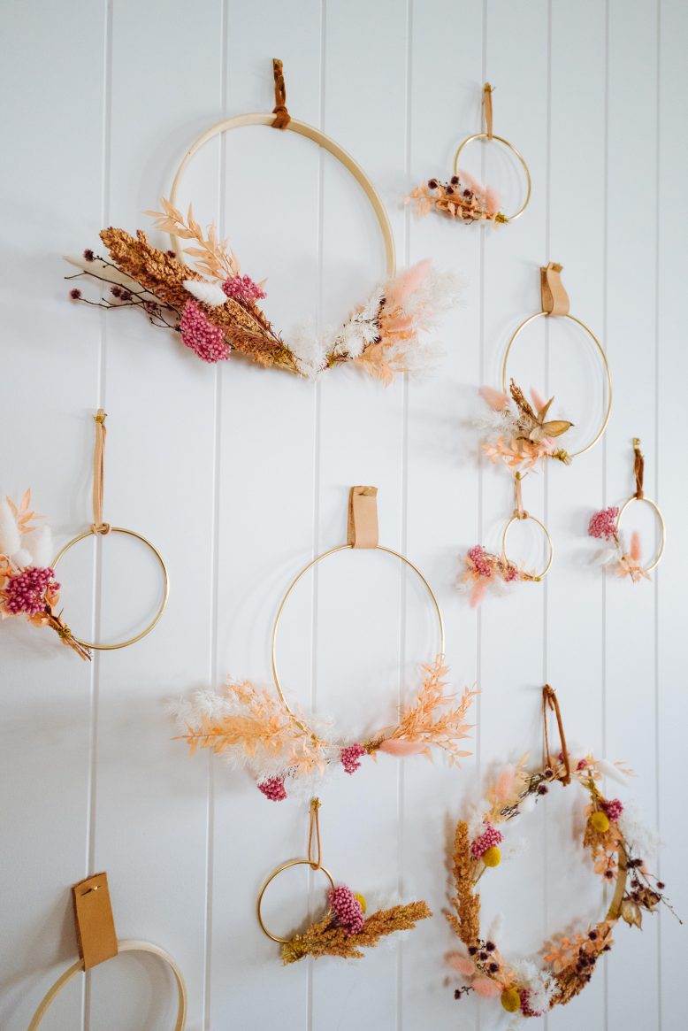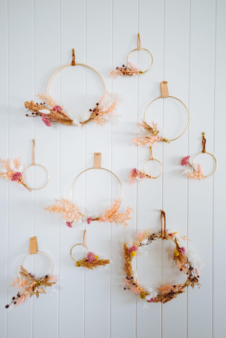 They are so great because they can be used as a wall hanging, on the front door, as a tree ornament (I’ve used them on my branch Christmas tree), as a gift topper or even taped to the front of a nice card. I liked to make them in a few different sizes, they don’t take long at all, and then use them in various ways throughout the holidays. The best thing is that no matter what design you choose, they usually look great, because the dried flowers lend the perfect festive feel! Anddddd because I’ve chosen non-traditional colours, they’ll see you through to new year and beyond. Yay!
