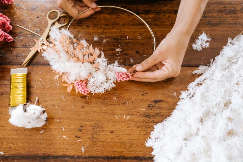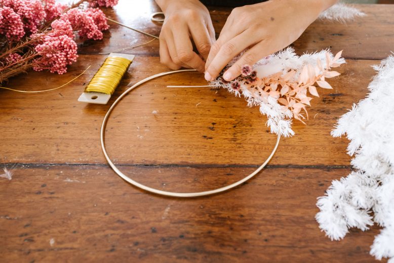 - Put your wreath together in layers. Start on one side, and consider first the largest part of the display. Cut a few flowers and use your wire to make a mini posey. Then, use some wire to attache it to the wreath. Make your wire nice and tight, so you don’t have t use too much, as this will make it bulky.