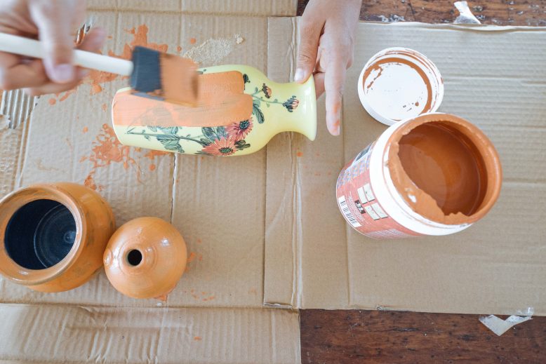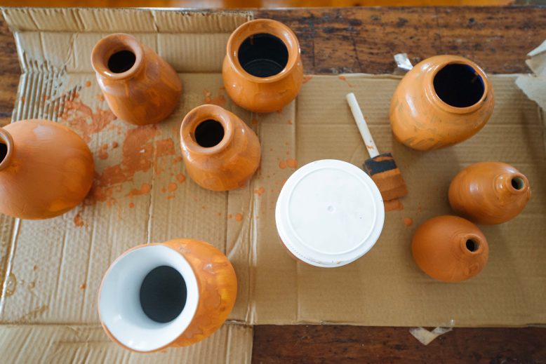- Paint your ceramics with the terracotta paint. The first coat will be quite translucent, but don’t worry!