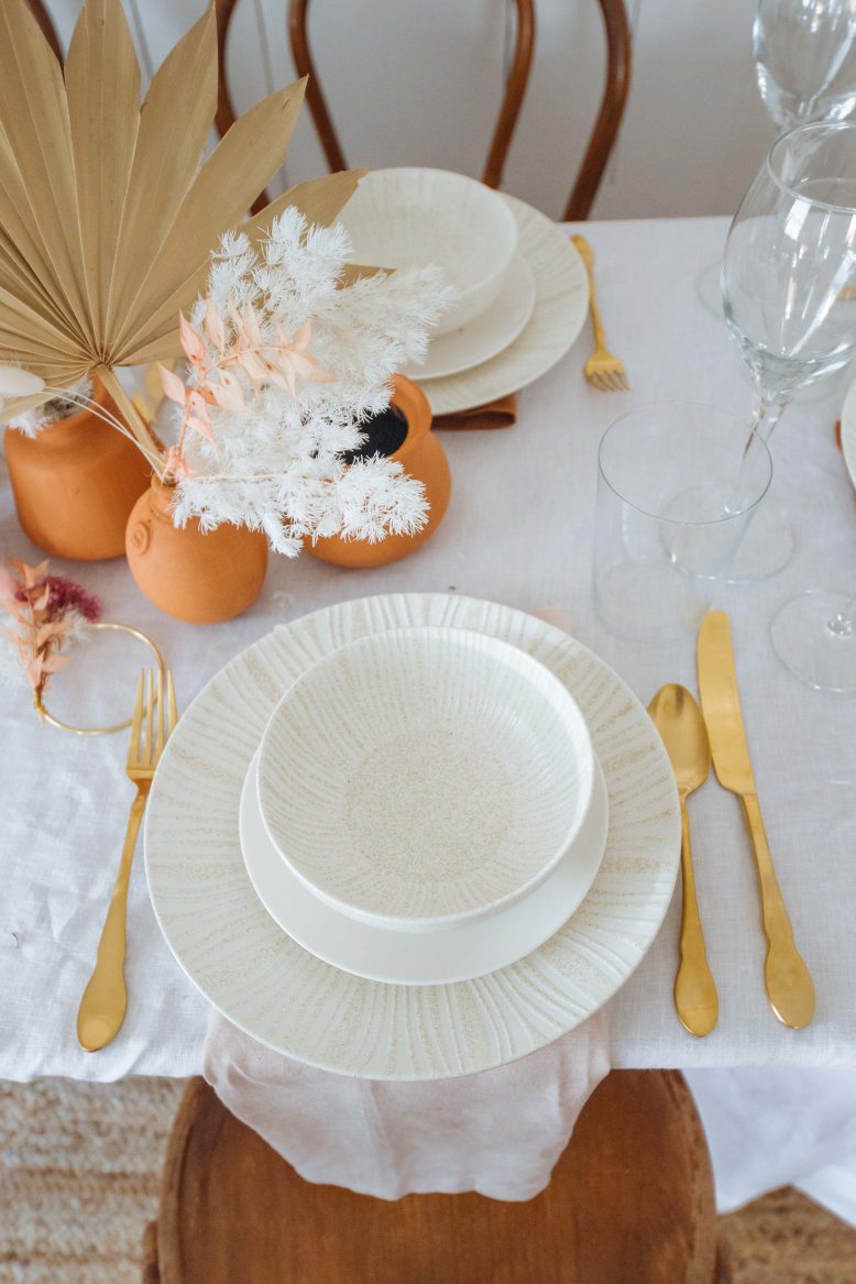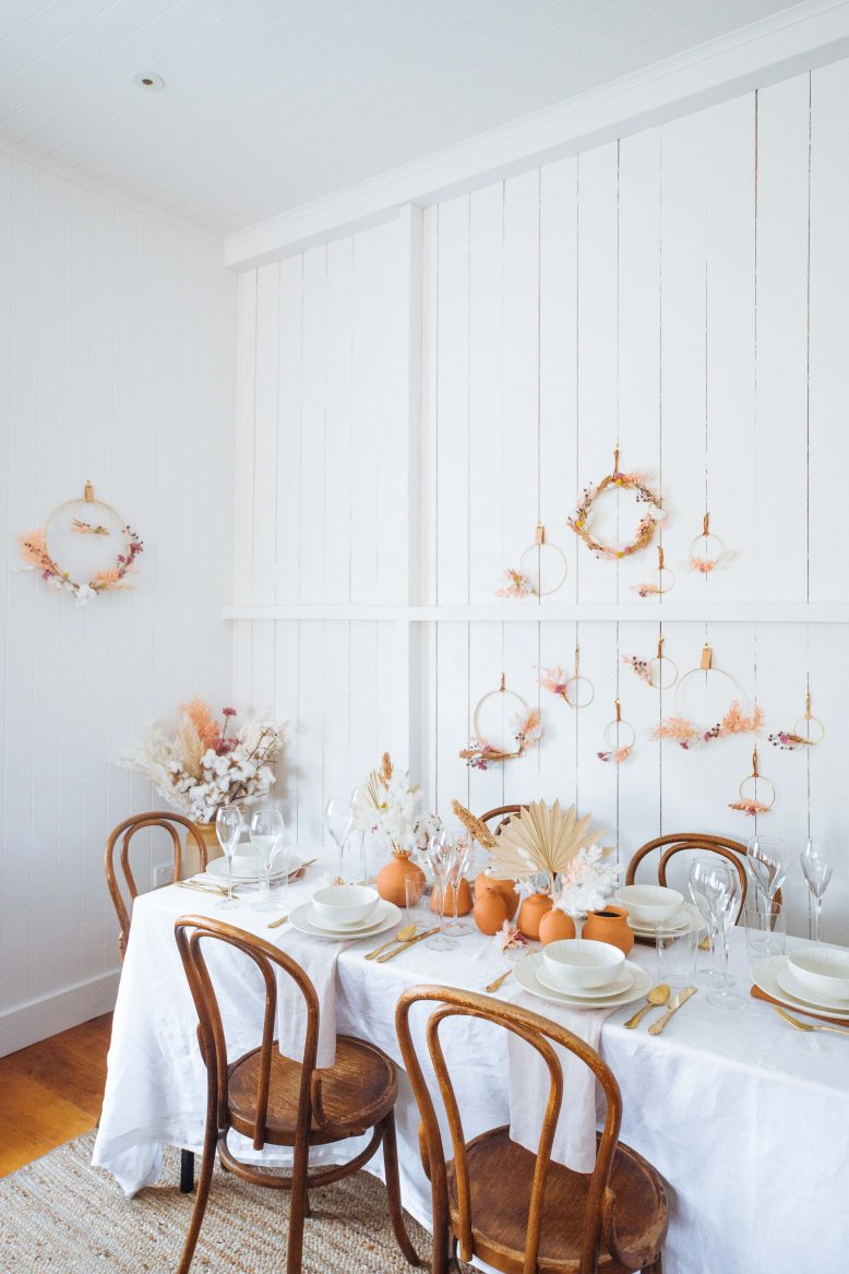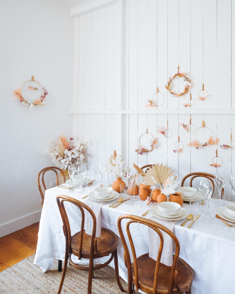 Some table styling is easy and can be thrown together very quickly, but for this space I took a bit more time to get it juuuuust right. In truth, it’s been something I’ve had in my head for a while and it was fun to see it come together. I used the plates, glassware and cutlery from last week’s post with Maxwell & Williams. The rest of the things on the table are thrown together – a linen sheet doubled as a tablecloth, fabric napkins made from linen and the up cycled centrepiece. The cherry on top is the beautiful dried floral arrangement (so easy to do!) anndddd those DIY ring wreaths.