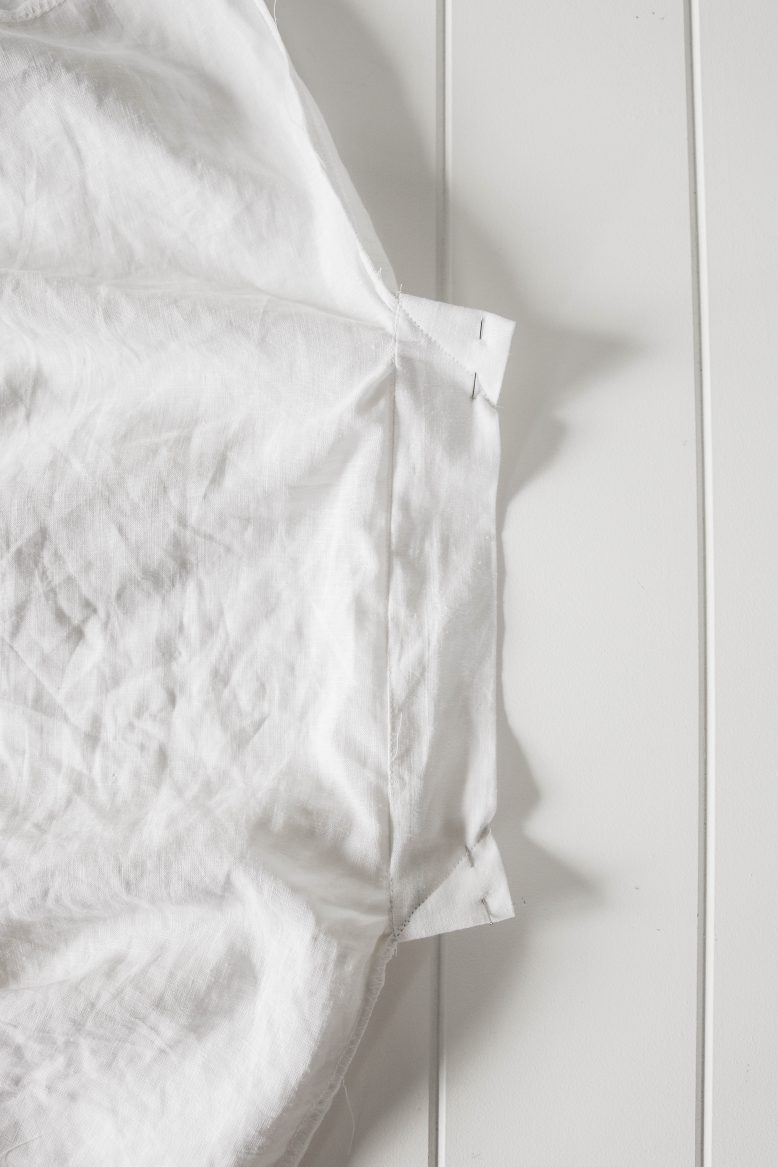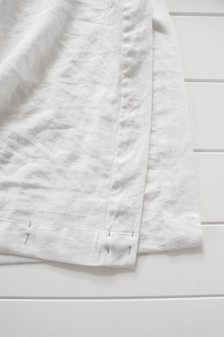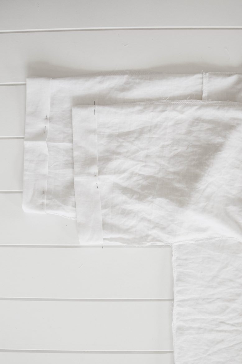 Next we’re going to hem the sleeves. Turn the robe inside out, then create a fold 1cm (½ in) in from the raw ends of the sleeves and press with an iron. Fold the ends in over themselves once more, this time 4cm (1.5 in). Press and pin in place before sewing to secure with a straight stitch.