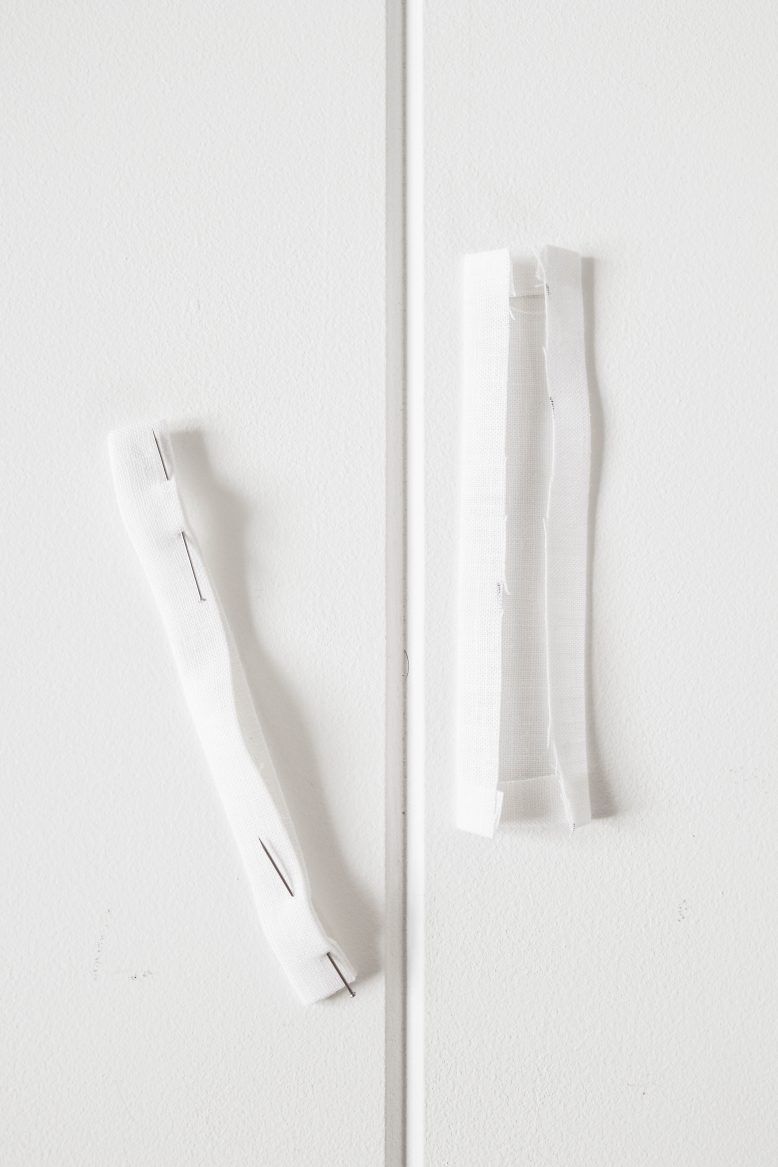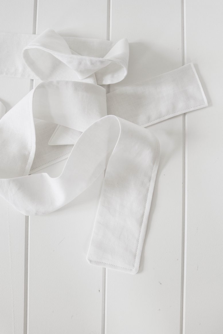 Create your tie band by folding the 15cm x 2m (6 x 78 in) panel in half along the long side. Pin together then sew along the long side and one short side. Through the open short side, turn the panel inside out and iron flat. Tuck the raw edges in on the open edge and sew along the long and short edges with a straight stitch for a neat finish.