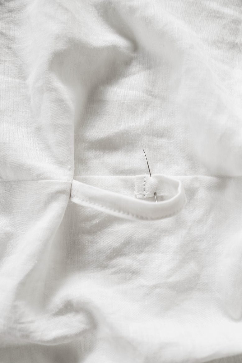 The best way to determine the placement of the tabs is by trying on the robe. Add your tie where it feels comfortable and mark where the tie sits with pins. Remove the robe, curl the edges of the tabs under and pin in place next to the side seam. Sew to attach then repeat this for the other side of the robe.