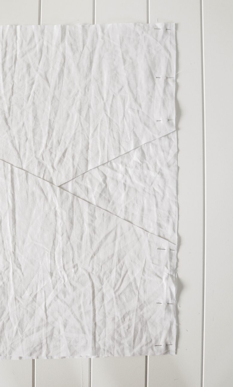 Cut out all pieces, making adjustments according to the size recommendations in our chart above. We made ours to a size S (Australian size 8), so we have included these measurements as a guide. Place the two front panels together with the right sides facing together. Measure the first point of your diagonal half way across the top short side, and mark the other point of your diagonal half way down the long side. Pin the fabric together to secure before tracing along this line and cut.