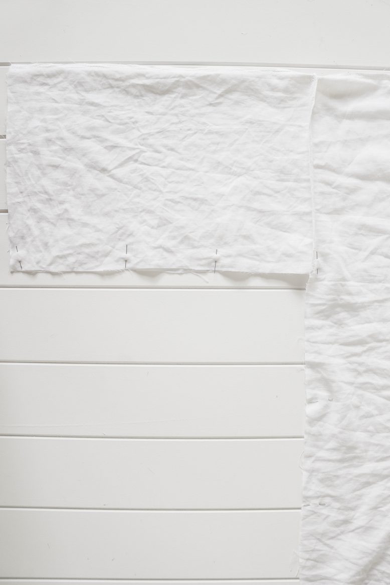 Lay your back panel flat with the right side facing up and place the front panels on top with the right side facing down, aligning the top edges in from the outer corners. Pin along the top edges and sew 1cm (½ in) in from the edge of the fabric using a straight stitch. For all seams in this DIY once you have sewn along the edge of the fabric, you can either use an overlocker to finish the edges, or simply sew a zigzag stitch using your machine just beside your straight stitch.