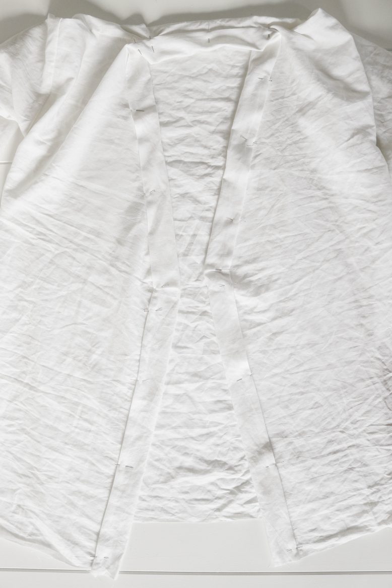 With your robe still facing inside out, take your long trim panel. Starting at the base of one of your front panels, pin this trim panel (right side facing down) along the front opening of the robe, around the back collar and down the opposite front side. Cut off any excess length, then sew with a straight stitch (no need to finish this edge as it will be covered in the next step).