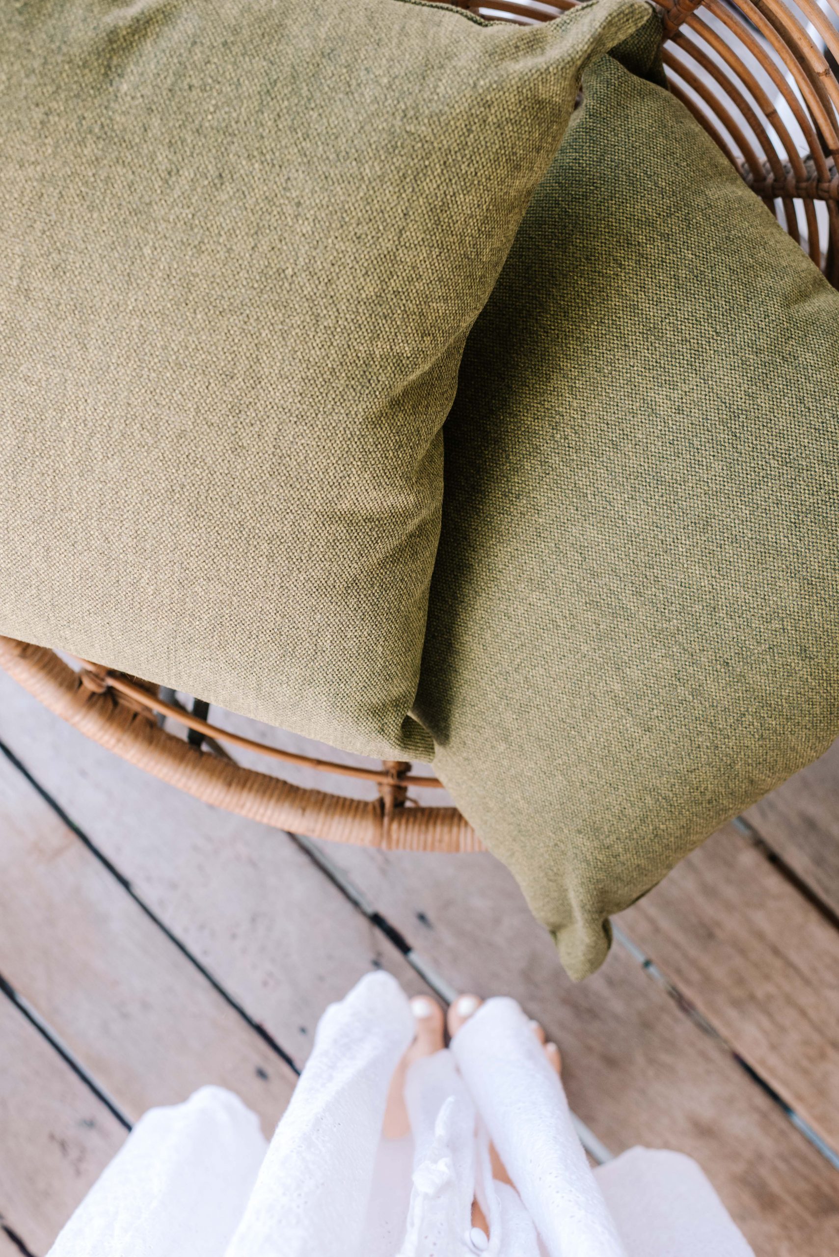 I was very lucky to find this vintage rattan two seater sofa on Gumtree, it was a little bit worse for wear but I sanded it and gave it a coat of lacquer to make sure it stood up under the elements. I knew that Sunbrella would be the ideal fabric to use for this space, not only is it comfortable but it is perfect in this outdoor environment. I wanted to create a piped cushion to reflect the sofa’s vintage character, so we made them myself using Sunbrella’s Natural Canvas (we’ll share a separate post on this shortly). I also added some gorgeous cushions in Sunbrella’s Blend Cactus fabric. They look so great in this space!