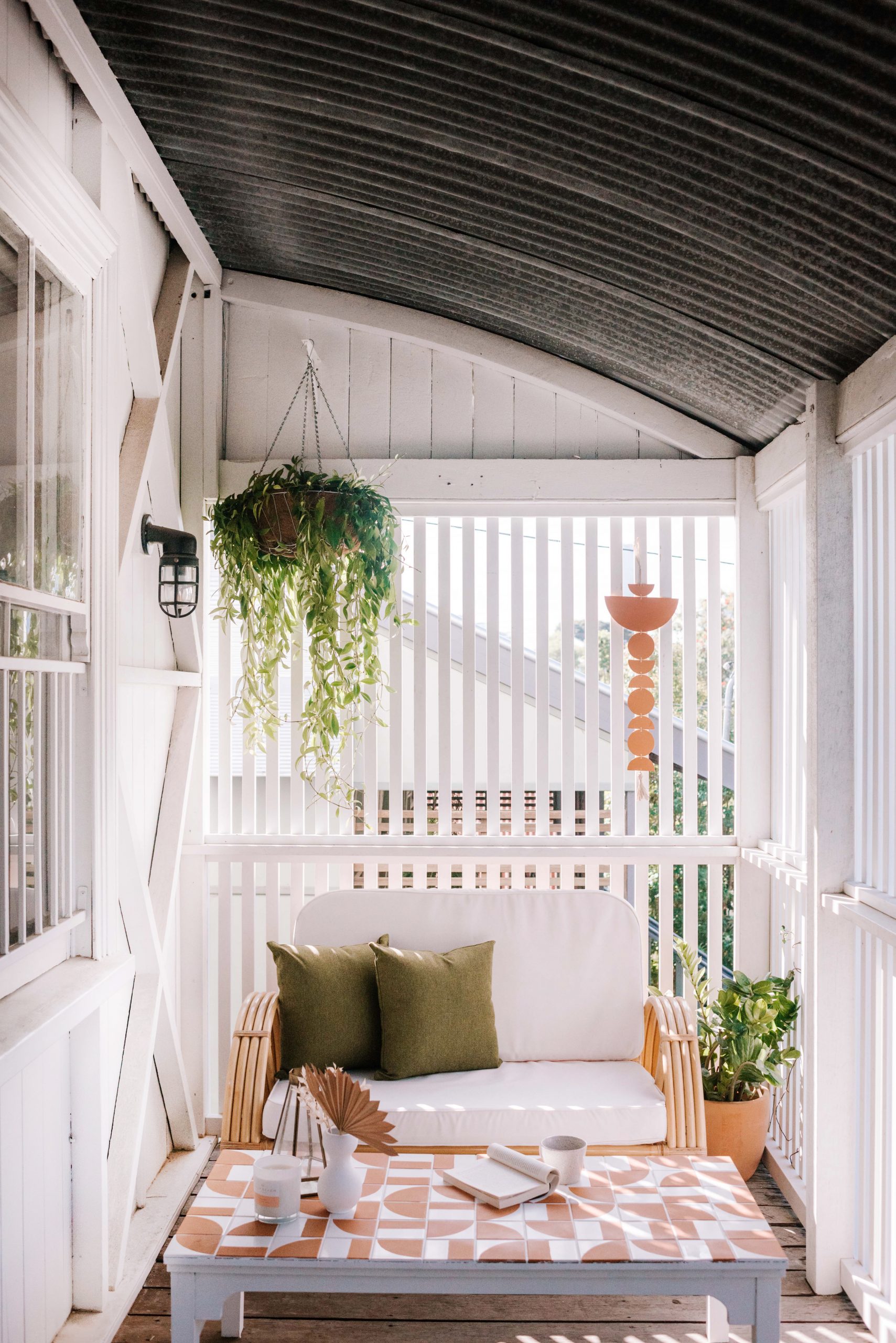 As some of you will already know, a little while ago we made a few changes to the front and the back of our house – adding wooden battens and pop out panels. They have added amazing privacy and have also kept our little gymnast Frankie from falling out! Since then I’ve been meaning to style the front deck but haven’t had the chance. I’ve spent a long time looking for furniture that would suit this space and stand up to the elements outside. I finally decided to get creative, and am excited to work with Sunbrella to give this space a little spruce. Sunbrella is the world leader in performance fabrics, which are amazing because they’re water resistant and mold resistant, and are also machine washable so are perfect if you’ve got kids! I knew they would be the perfect foundation for a calm and inviting deck.