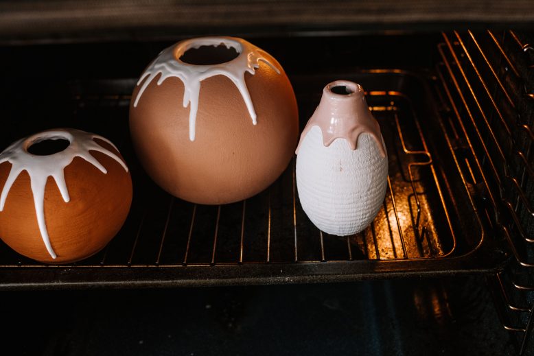 Once your oven is warm, place your vases into it for five minutes to warm them up. I found that using warm vases helped to set the drips nicely prior to putting them in the oven. Using an oven mitt, remove your vase from the oven.