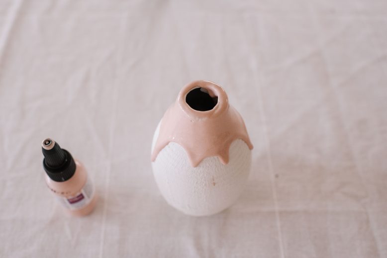 Working quickly, squeeze the liquid clay along the top edge of the vase. Move your hand in a sweeping motion to promote the drips.