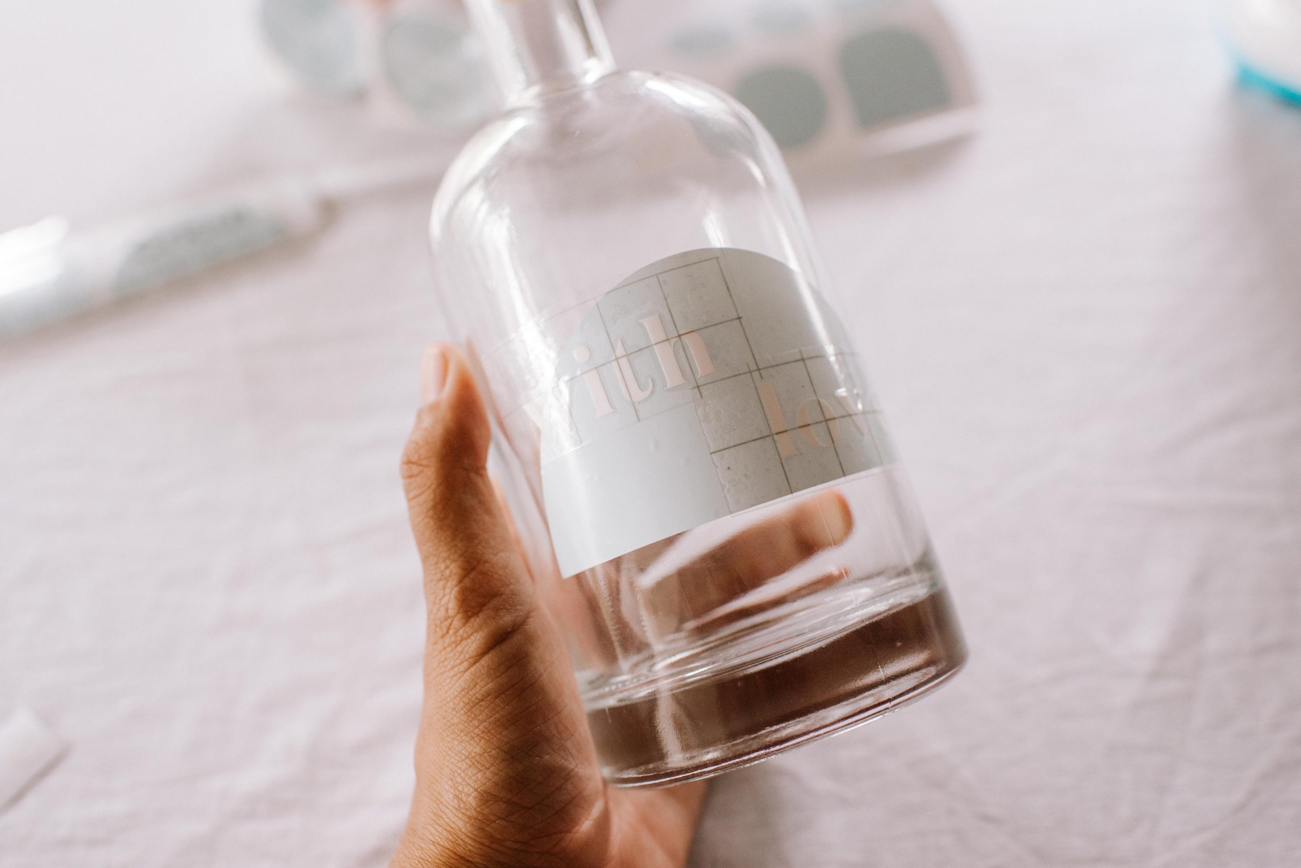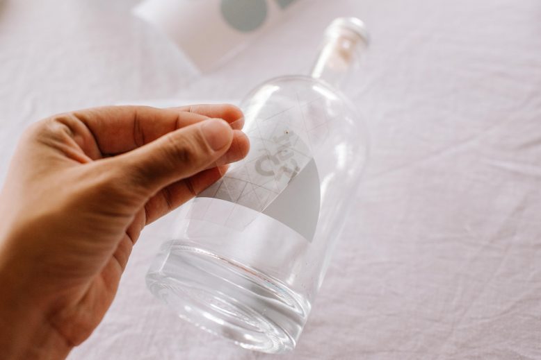 Press the design and Transfer Tape onto the bottle. Use the lines on your Transfer Tape to make sure the vinyl is in line. Use your scraper for a seamless bond on the glass. If any small bubbles get caught under the vinyl, I found you can carefully move them to the edges.