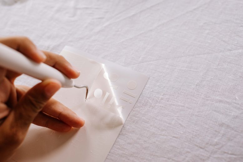Using your Transfer Tape, carefully cover your design and use the scraping tool to make sure it is perfectly bonded with no air bubbles. Remove the white backing from your Transfer Tape. This can be a little tricky depending on how intricate your design is, so take it slowly.