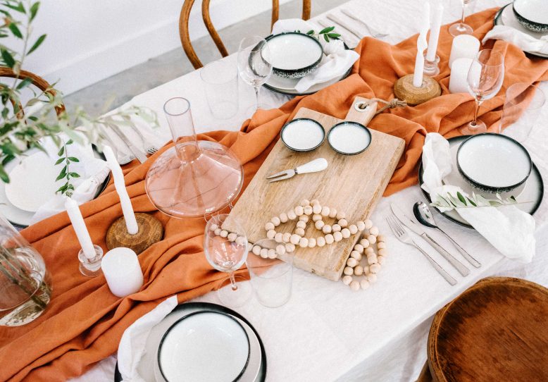 It can be tricky settling on colours for your table, and it’s always worth thinking about how the setting will look as a whole. I like to pick the plate colours and then the tablecloth, knowing that those things will be the ones that influence the whole look. I actually thought about using the rust coloured tablecloth as the base for the whole table, but then decided to do a white base and then the rust as a runner. This really helped the other elements shine.