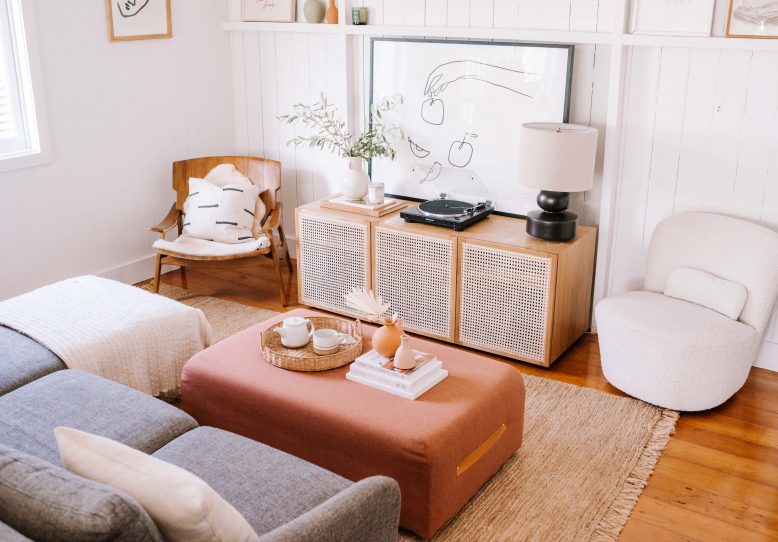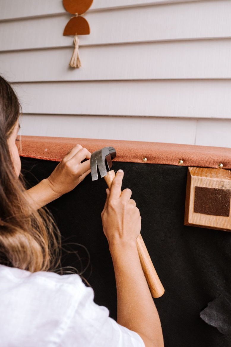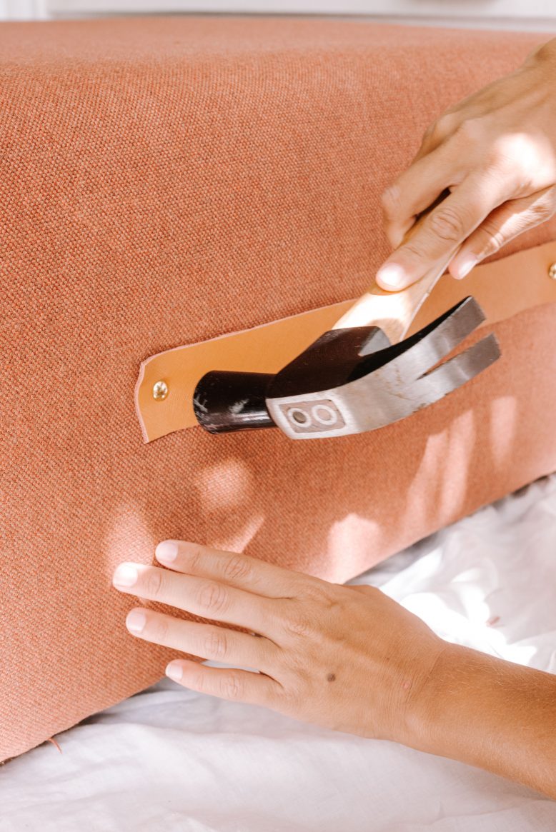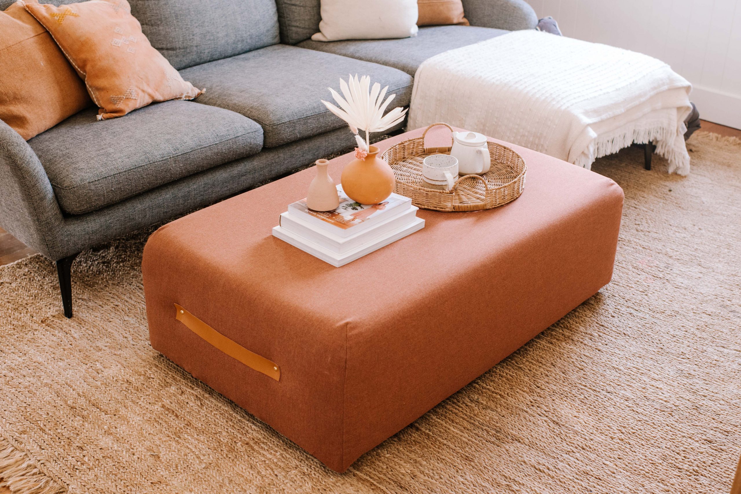 Whether it’s gotten a little worn or you don’t like the fabric or print anymore, it doesn’t mean you have to throw it away. That’s because they are so easy to update. A little while ago we shared a post about making your living room more family friendly, and in it we did an upcycle of an old ottoman using beautiful Sunbrella Blend Clay fabric. Lots of you asked for the detailed tutorial so here it is!