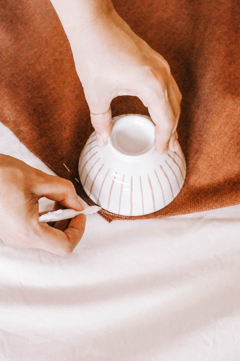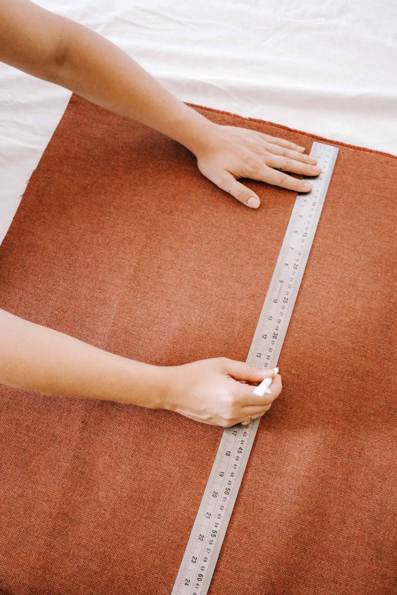 Gently take the fabric off the ottoman, being mindful of your pins. Our ottoman had quite curved corners on the top edges so to ensure the fabric sat flush over these we wanted to create a rounded dart. Use a round object (a small bowl is perfect) trace a curve to guide your seam line on the machine.