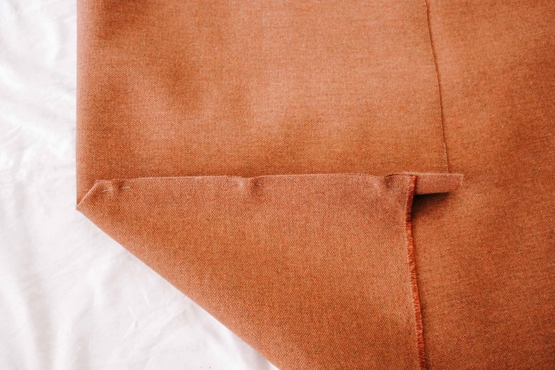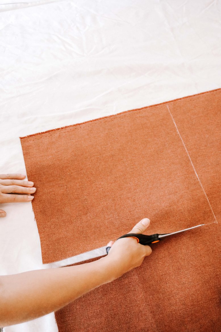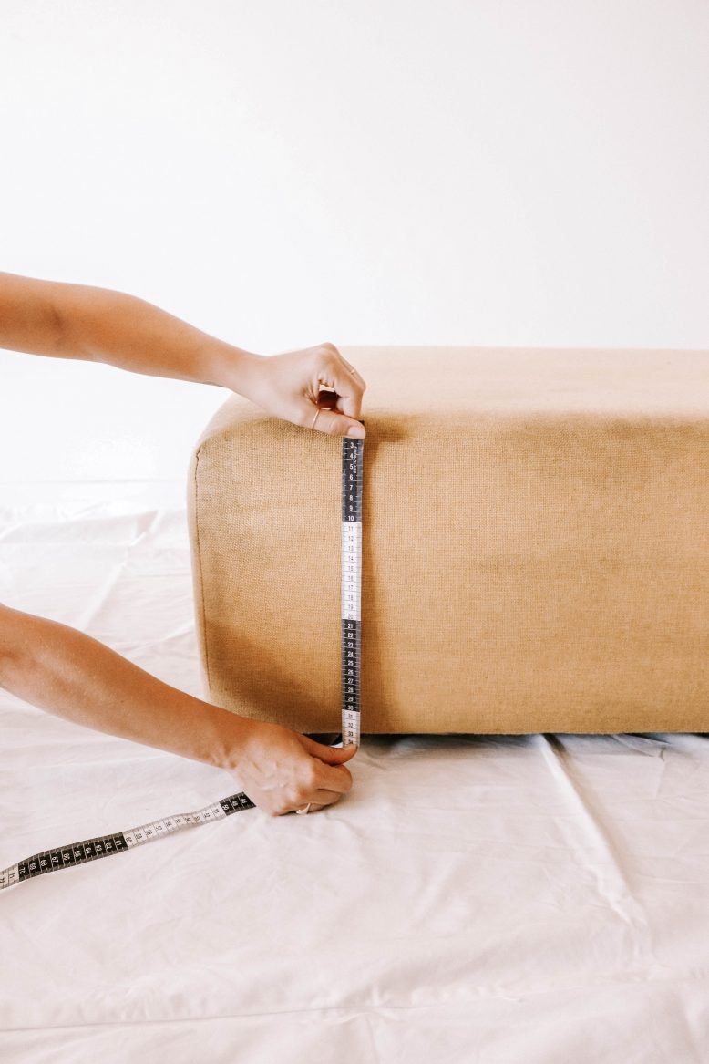 Our fabric was wide enough that we could do a wrapped top without seams along the top edges, only those along the outer sides of the ottoman. This meant our process was a little bit simpler. However if your fabric isn’t wide enough to do this, rather than cutting out one single piece for the cover you can cut each side individually and sew along the top edges. The general process here will then remain the same.