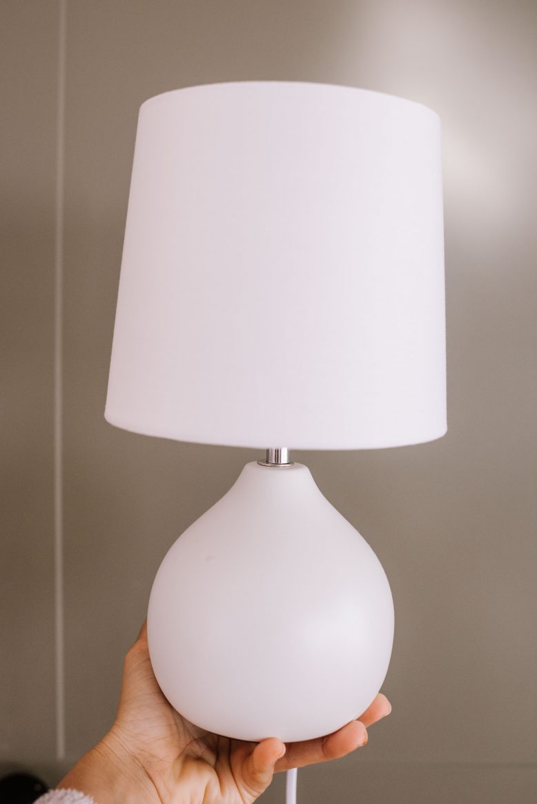 - Start by removing the lampshade from the base. Add painter’s tape to the electrical cord and lightbulb socket.