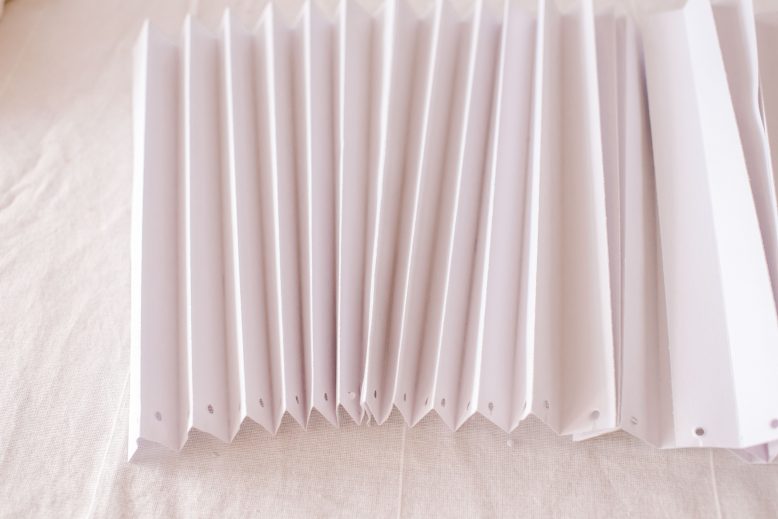 - Mark evenly spaced lines on the paper (I used 3cm sections) and fold along those lines to created a pleated look. Glue additional pieces of paper together along the edge. Tip: The amount of pleats also affects how it sits on the lamp shade frame (less pleats will flare out further, while more pleats will sit closer to the frame).