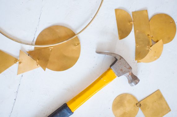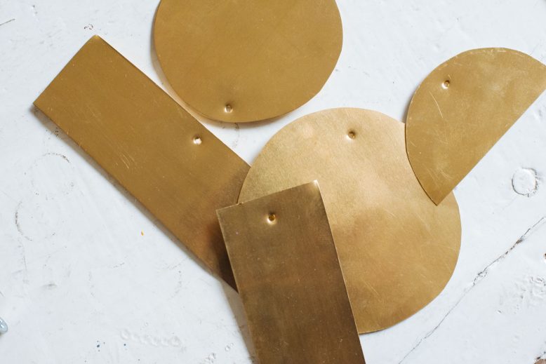 Rest each brass shape on the wooden block and use a hammer and large nail to punch a hole into the top (and bottom, if the piece is a linking piece) of each shape.
