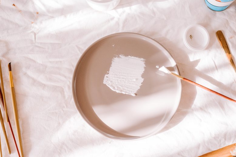 - Using the 2cm wide brush, paint on the chalk paint. To give the effect of hand spun ceramic, paint in a circle motion making rings from the middle of the plate outwards.