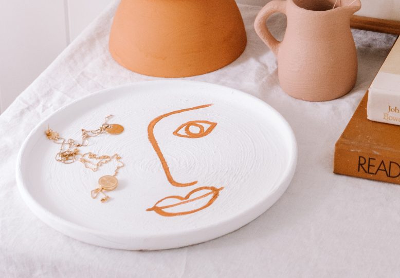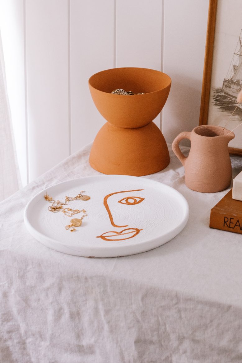 I found this plate at my local Vinnies and transformed into a face plate using my tried and tested Trash To Terracotta method. I love how this paint makes anything look like rustic, hand spun beauties. In case you’re interested it’s not food safe – so for now it is purely for decorating but is perfect for displaying jewellery or as a simple centrepiece.