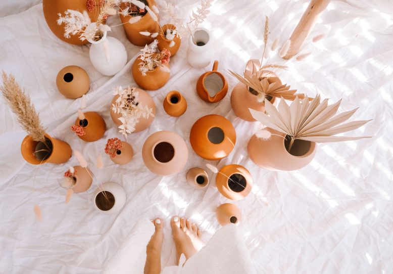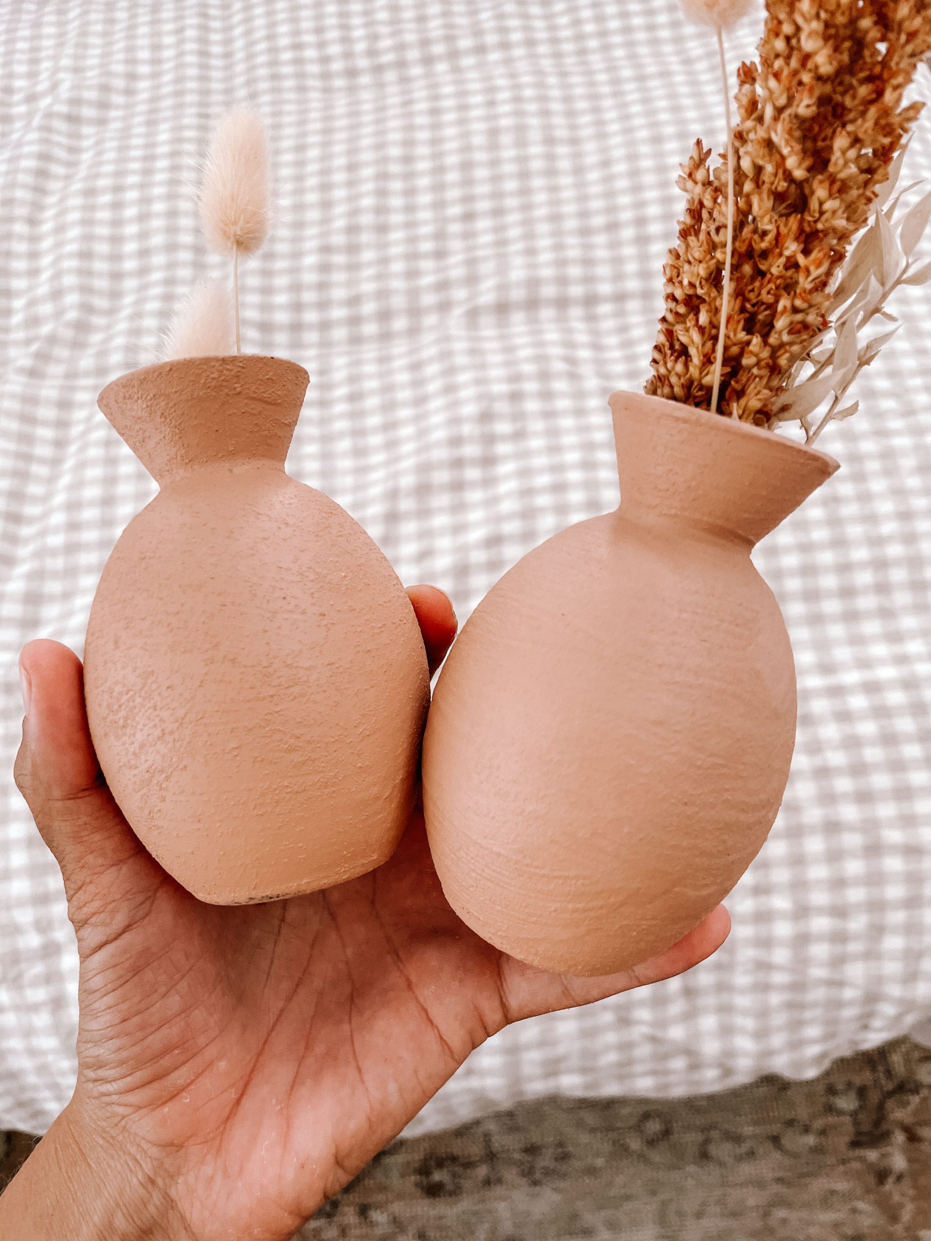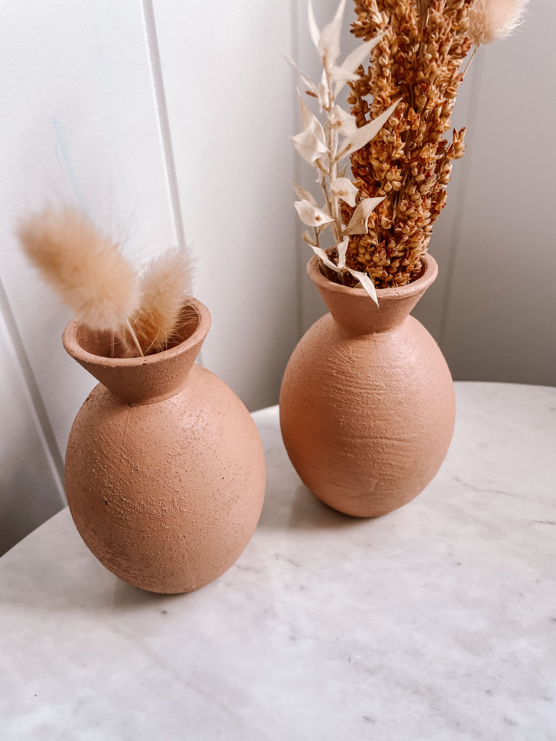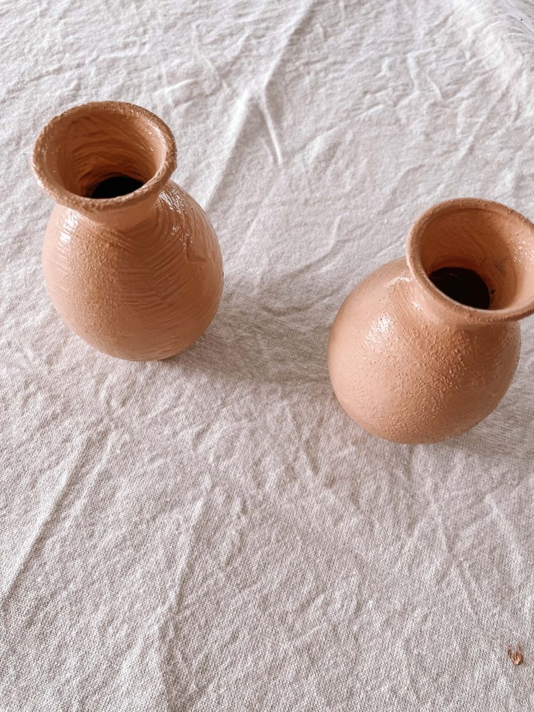 If you prefer a thicker coat that looks more like ceramic or if you need to properly cover imperfections or an underlying pattern, then baking powder is the one for you! If you prefer a minimalist look that shows up details or lines in your vase, but still have a grainy look, the baking soda is the one for you.