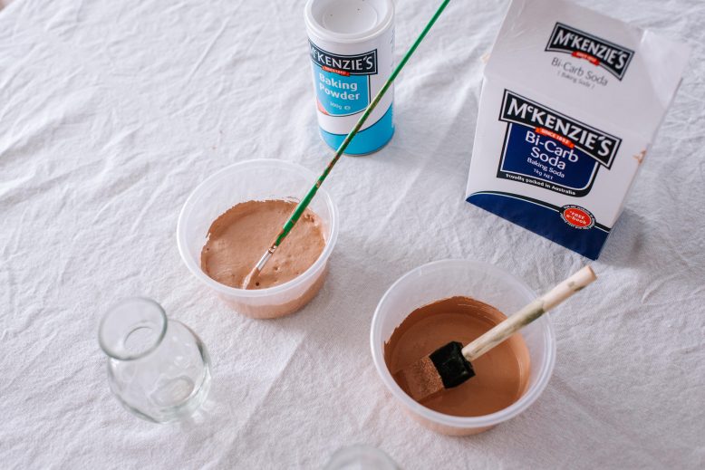 The first thing is to understand the difference between these two additives. Baking Powder and Baking Soda (aka bicarb soda) are very similar and designed for adding to baked goods to create a rise. The difference between them is that Baking Powder has an acid in it that means all you need is to add water to create a reaction. On the other hand, Baking Soda doesn’t have acid in it so there isn’t a bubbly reaction when added to water unless you add lemon or another acid. For this project, it’s the water in the paint that creates the change in texture.