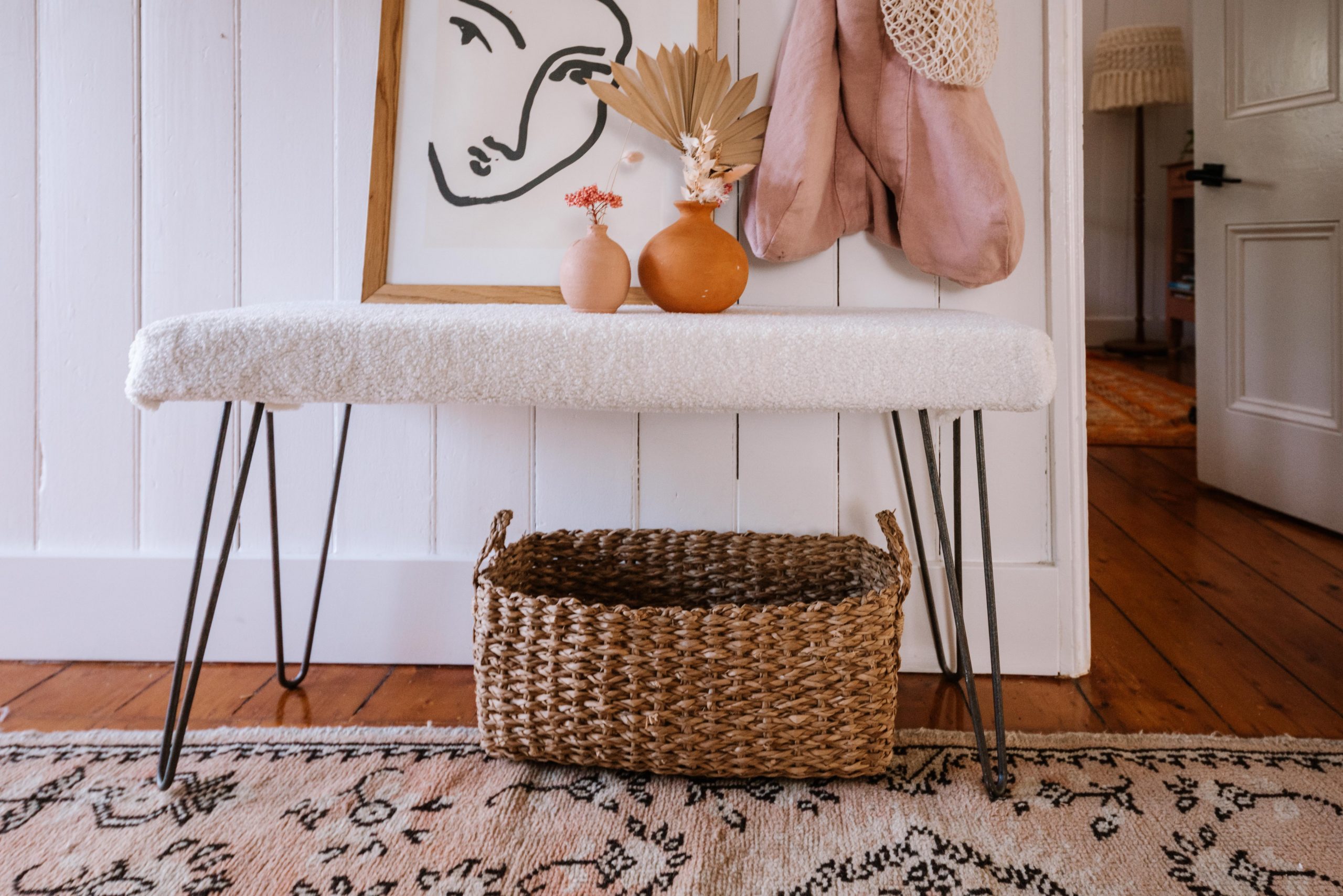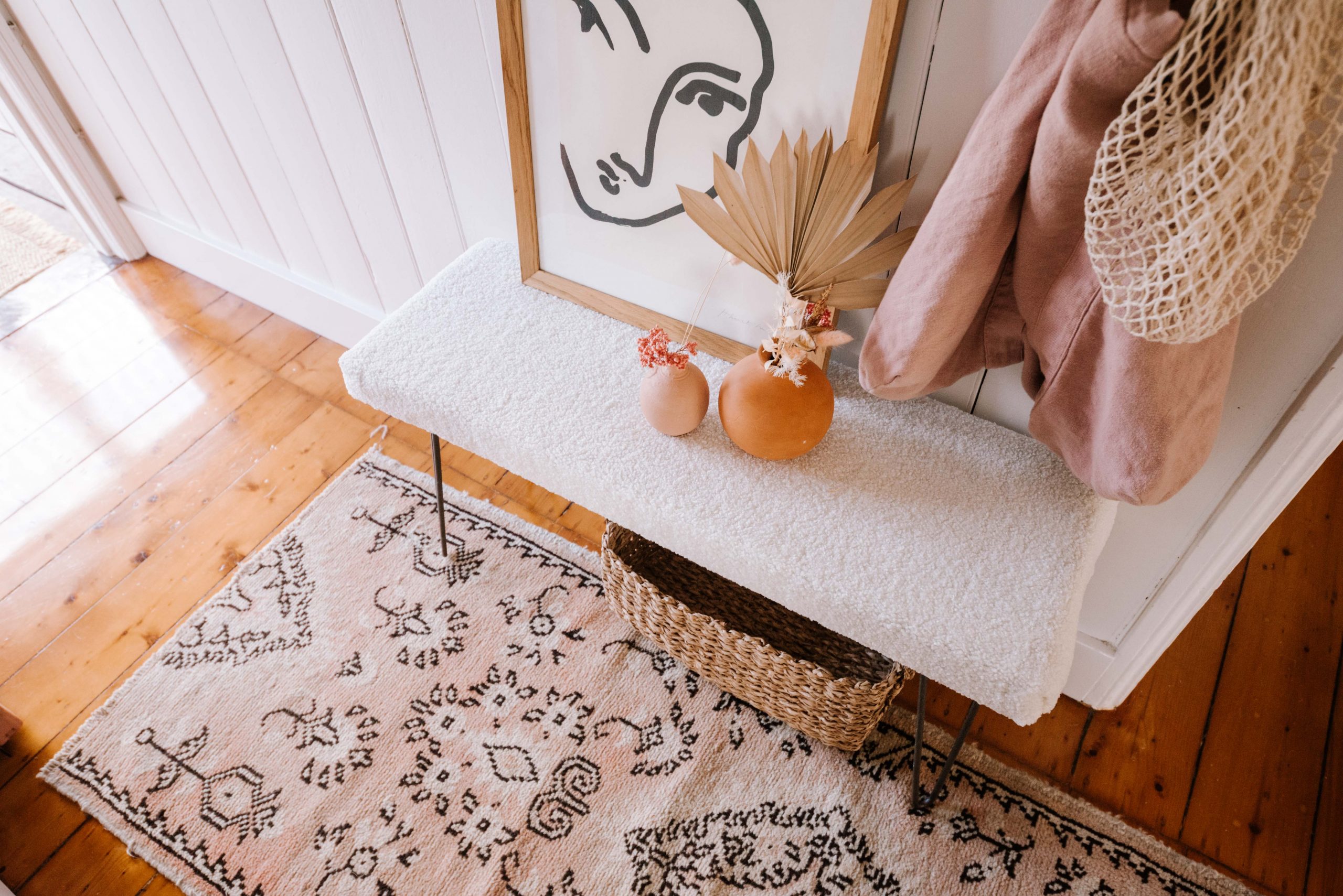 Voila! For further info on how to style your new boucle bench seat, be sure to read my tips on styling a small entry way. I love how this turned out, and now I can’t wait to try it in other fabrics.