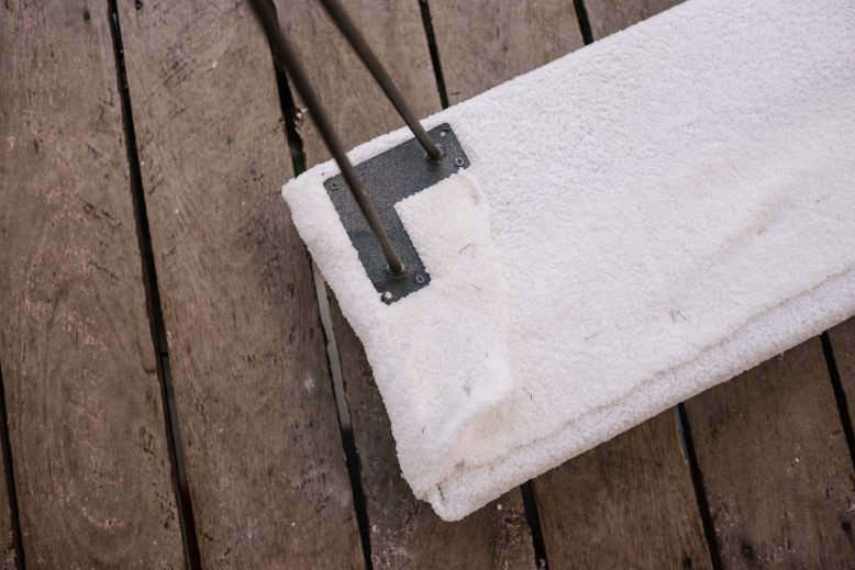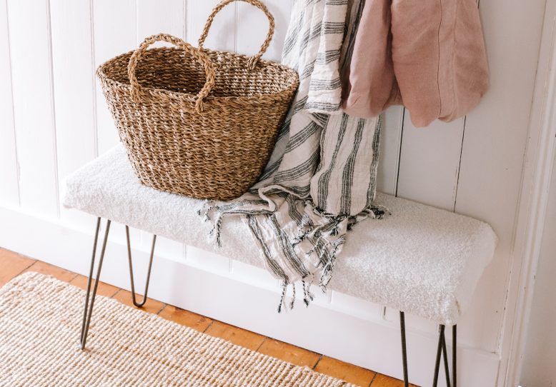 Recently I wanted to update our entryway. The purpose of the space was to be a place where we could put our shoes on before heading out and place bags when coming back in to the house. I didn’t have a lot of room in the space, so I knew a slim line bench seat was my best option. I just couldn’t find the dimensions I needed in any of the furniture shops so I knew this was a great opportunity to try a DIY project. I went with a fun fabric that is very on trend right now – bouclé! With this project, the design options are endless as you can pick any fabric to complement your decor.
