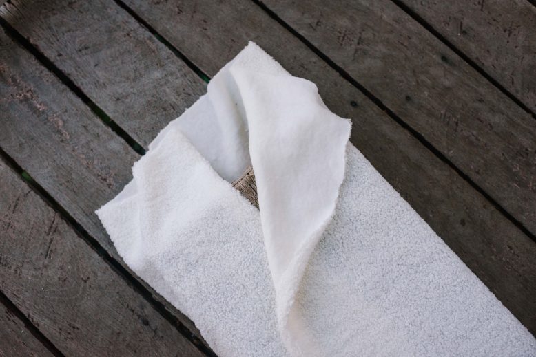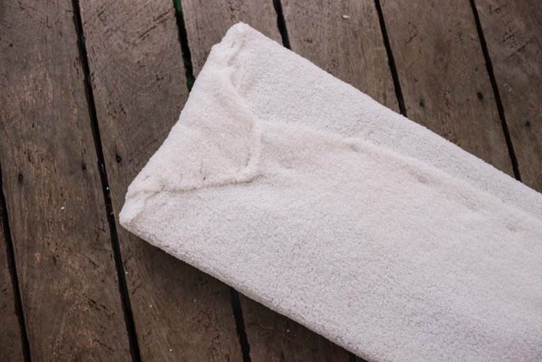 Roll out the fabric and place the foam in the centre. Place the wooden plank on top of the foam.