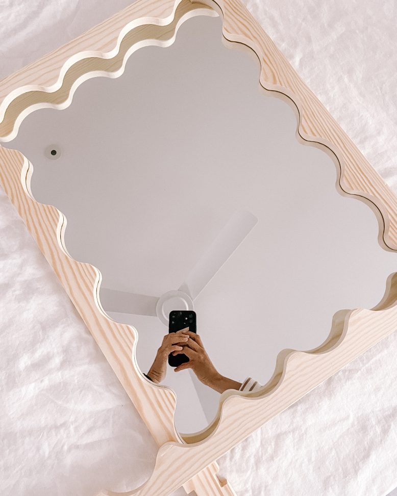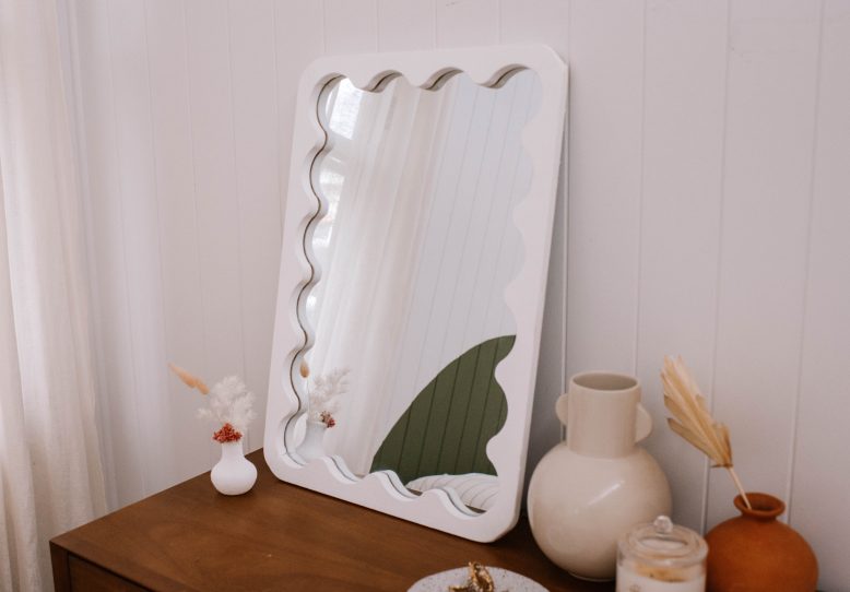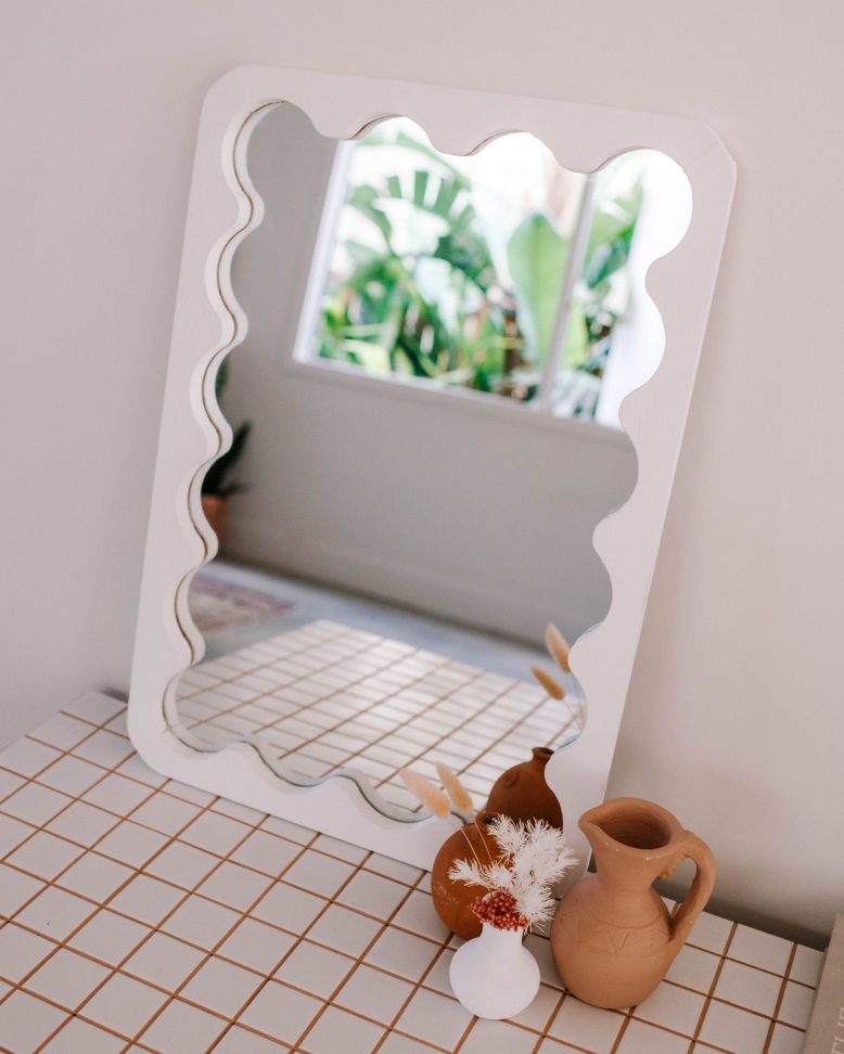 I’ve been pondering the idea of a wavy mirror for ages, but have been wanting to find an easy way to do it. I love a very symmetrical look, and I knew it would be hard to get that if I cut a frame free hand, but one day I had a little brainwave! I was walking through Bunnings and stumbled upon some wooden wine racks that had the PERFECT wave. The wine rack came in pieces so it was easy to imagine using them to make something. Andddd they were on clearance for $8. And hence the idea for this wine rack was born!