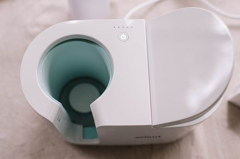 Once the design is well pressed onto the mug, it’s time to insert your mug into the Mug Press. The press will make a beeping noise (and the power button will turn green) when it is ready to use and once you hear that, lift the lever to open the press. Tilt your mug to the side a little so that the design doesn’t catch on the sides of the press, and push it down into the Mug Press, so that the handle sits in the centre of the opening.