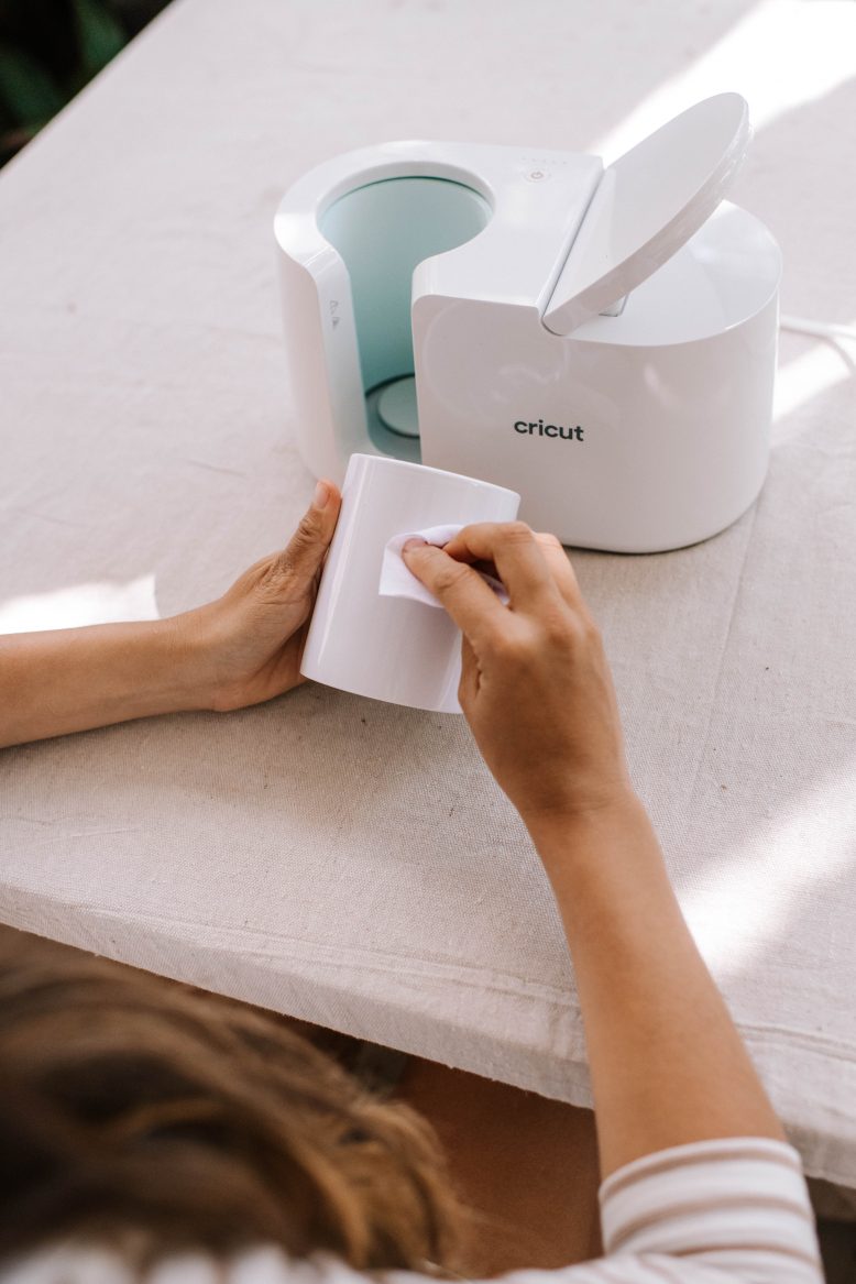 Next, it’s time to apply the design to the mug. First, carefully clean your mug with the cloth and a lint roller.