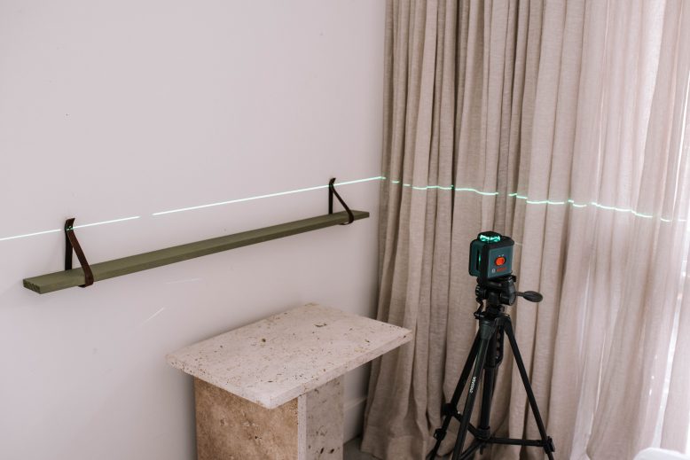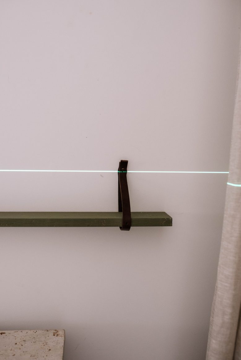 For the next two shelves, I switched modes on the level, to show both the vertical and horizontal levels. I simply lined up the middle of each shelf with the vertical line shown by the level, marked where the leather needed to go and then hung them. It was so easy!
