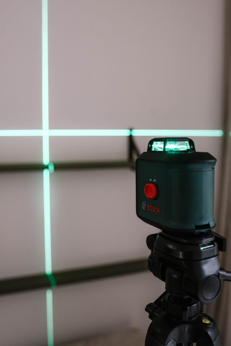 The next thing I did was set up my UniversalLevel 360. I placed it onto a tripod, and set it up in front of the wall where I wanted to erect the shelves. When I turned on the level it showed the horizontal self level to show me where to hang the first shelf.