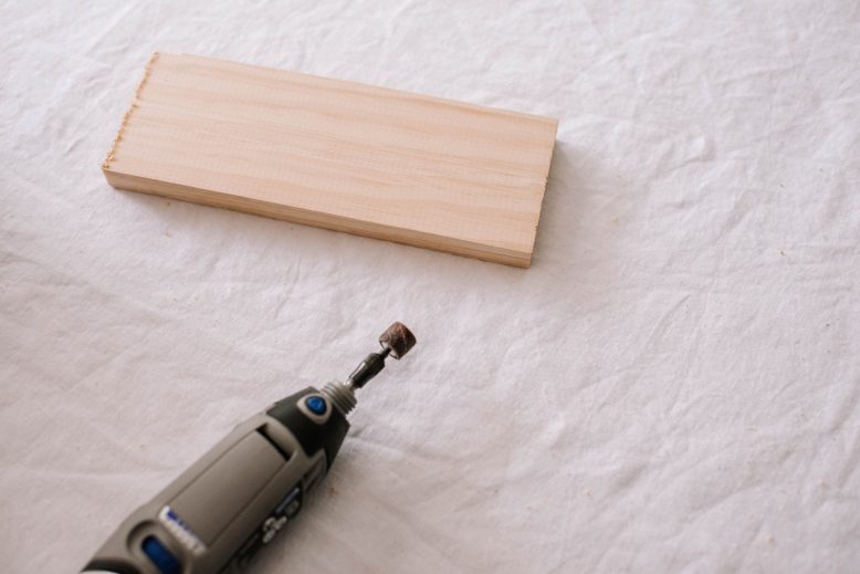 To secure the shelves I am going to use hanging leather, I like the organic feel this gives them. I used the Dremel to drill holes in the thick leather where they would be hung from the wall on picture hooks. The next thing I did was measure and mark the centre of the shelves.